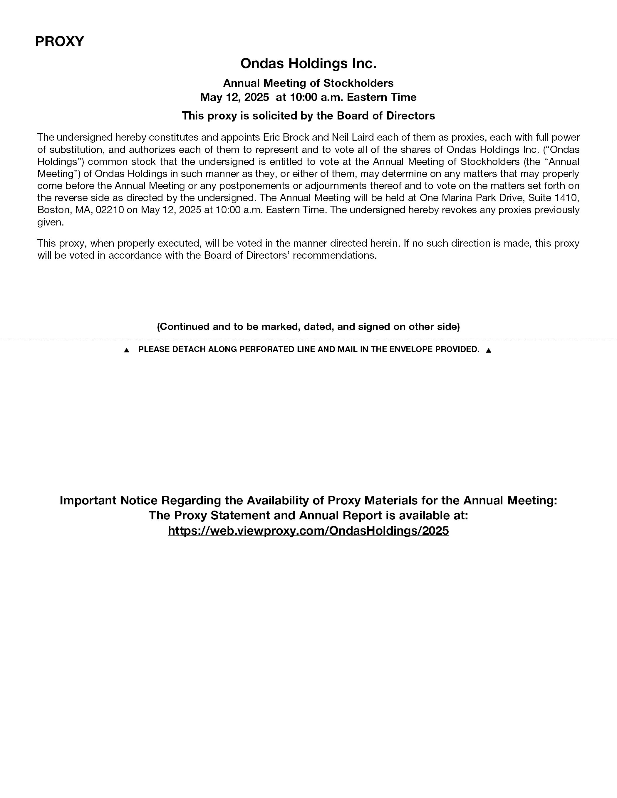 Ondas Holdings Inc. Annual Meeting of Stockholders May 12, 2025 at 10:00 a.m. Eastern Time This proxy is solicited by the Board of Directors The undersigned hereby constitutes and appoints Eric Brock and Neil Laird each of them as proxies, each with full power of substitution, and authorizes each of them to represent and to vote all of the shares of Ondas Holdings Inc. (“Ondas Holdings”) common stock that the undersigned is entitled to vote at the Annual Meeting of Stockholders (the “Annual Meeting”) of Ondas Holdings in such manner as they, or either of them, may determine on any matters that may properly come before the Annual Meeting or any postponements or adjournments thereof and to vote on the matters set forth on the reverse side as directed by the undersigned. The Annual Meeting will be held at One Marina Park Drive, Suite 1410, Boston, MA, 02210 on May 12, 2025 at 10:00 a.m. Eastern Time. The undersigned hereby revokes any proxies previously given. This proxy, when properly executed, will be voted in the manner directed herein. If no such direction is made, this proxy will be voted in accordance with the Board of Directors’ recommendations. (Continued and to be marked, dated, and signed on other side) PLEASE DETACH ALONG PERFORATED LINE AND MAIL IN THE ENVELOPE PROVIDED. Important Notice Regarding the Availability of Proxy Materials for the Annual Meeting: The Proxy Statement and Annual Report is available at: https://web.viewproxy.com/OndasHoldings/2025