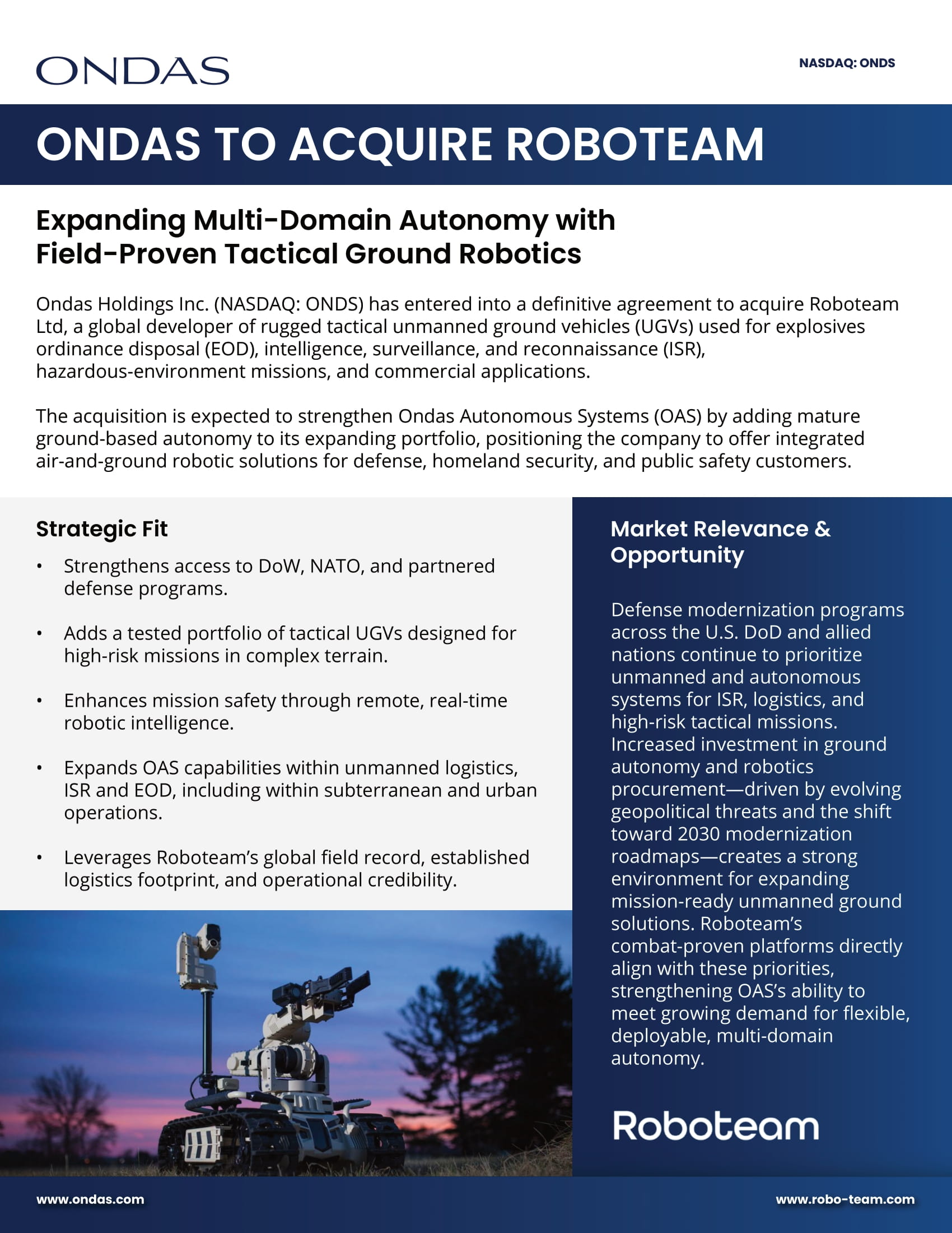NASDAQ: ONDS Expanding Multi - Domain Autonomy with Field - Proven Tactical Ground Robotics Ondas Holdings Inc. (NASDAQ: ONDS) has entered into a definitive agreement to acquire Roboteam Ltd, a global developer of rugged tactical unmanned ground vehicles (UGVs) used for explosives ordinance disposal (EOD), intelligence, surveillance, and reconnaissance (ISR), hazardous - environment missions, and commercial applications. The acquisition is expected to strengthen Ondas Autonomous Systems (OAS) by adding mature ground - based autonomy to its expanding portfolio, positioning the company to offer integrated air - and - ground robotic solutions for defense, homeland security, and public safety customers . ONDAS TO ACQUIRE ROBOTEAM • Strengthens access to DoW, NATO, and partnered defense programs. • Adds a tested portfolio of tactical UGVs designed for high - risk missions in complex terrain. • Enhances mission safety through remote, real - time robotic intelligence. • Expands OAS capabilities within unmanned logistics, ISR and EOD, including within subterranean and urban operations. • Leverages Roboteam’s global field record, established logistics footprint, and operational credibility. Strategic Fit Defense modernization programs across the U.S. DoD and allied nations continue to prioritize unmanned and autonomous systems for ISR, logistics, and high - risk tactical missions. Increased investment in ground autonomy and robotics procurement — driven by evolving geopolitical threats and the shift toward 2030 modernization roadmaps — creates a strong environment for expanding mission - ready unmanned ground solutions. Roboteam’s combat - proven platforms directly align with these priorities, strengthening OAS’s ability to meet growing demand for flexible, deployable, multi - domain autonomy. Market Relevance & Opportunity www.ondas.com www.robo - team.com