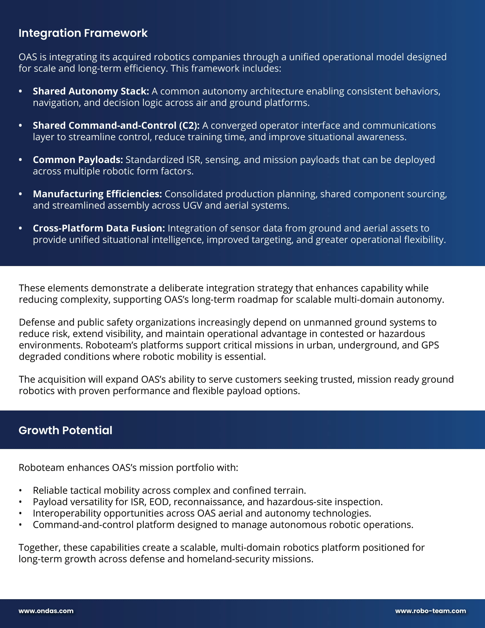 These elements demonstrate a deliberate integration strategy that enhances capability while reducing complexity, supporting OAS’s long - term roadmap for scalable multi - domain autonomy. Defense and public safety organizations increasingly depend on unmanned ground systems to reduce risk, extend visibility, and maintain operational advantage in contested or hazardous environments. Roboteam’s platforms support critical missions in urban, underground, and GPS degraded conditions where robotic mobility is essential. The acquisition will expand OAS’s ability to serve customers seeking trusted, mission ready ground robotics with proven performance and flexible payload options. www.ondas.com www.robo - team.com Integration Framework OAS is integrating its acquired robotics companies through a unified operational model designed for scale and long - term efficiency. This framework includes: • Shared Autonomy Stack: A common autonomy architecture enabling consistent behaviors, navigation, and decision logic across air and ground platforms. • Shared Command - and - Control (C2): A converged operator interface and communications layer to streamline control, reduce training time, and improve situational awareness. • Common Payloads: Standardized ISR, sensing, and mission payloads that can be deployed across multiple robotic form factors. • Manufacturing Efficiencies: Consolidated production planning, shared component sourcing, and streamlined assembly across UGV and aerial systems. • Cross - Platform Data Fusion: Integration of sensor data from ground and aerial assets to provide unified situational intelligence, improved targeting, and greater operational flexibility. Growth Potential Roboteam enhances OAS’s mission portfolio with: • Reliable tactical mobility across complex and confined terrain. • Payload versatility for ISR, EOD, reconnaissance, and hazardous - site inspection. • Interoperability opportunities across OAS aerial and autonomy technologies. • Command - and - control platform designed to manage autonomous robotic operations. Together, these capabilities create a scalable, multi - domain robotics platform positioned for long - term growth across defense and homeland - security missions.