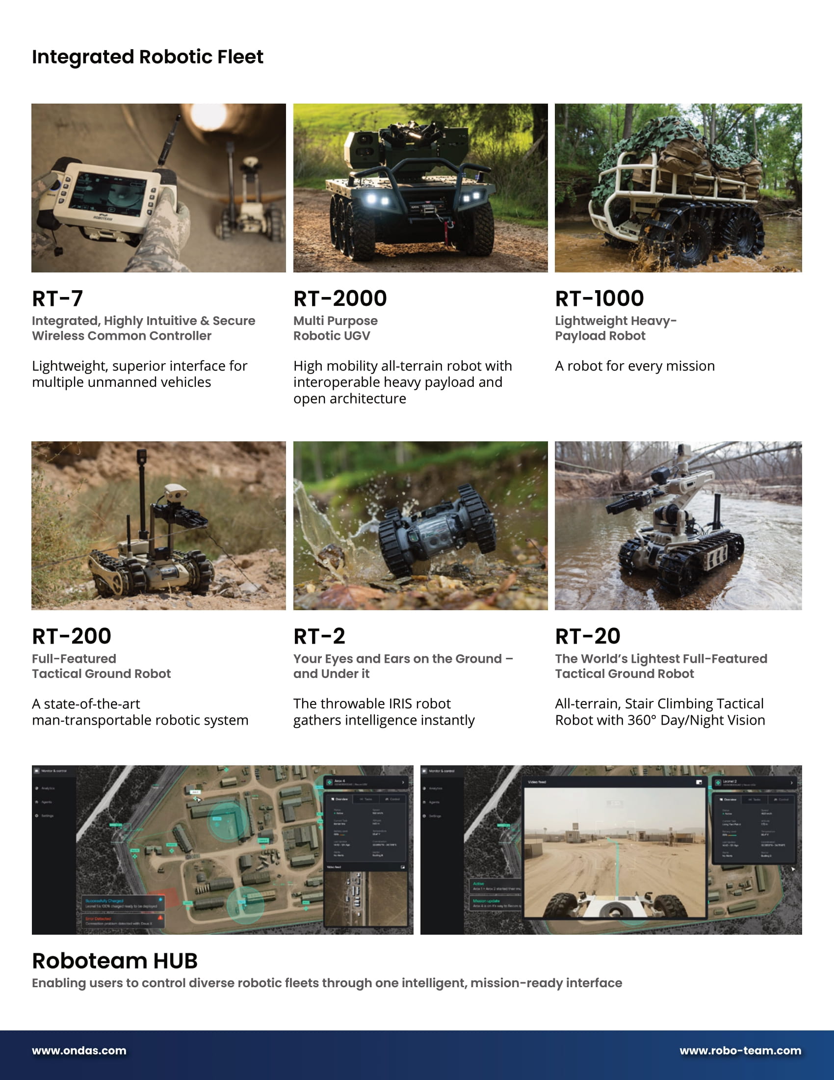 Integrated Robotic Fleet Lightweight, superior interface for multiple unmanned vehicles RT - 7 Integrated, Highly Intuitive & Secure Wireless Common Controller High mobility all - terrain robot with interoperable heavy payload and open architecture RT - 2000 Multi Purpose Robotic UGV A robot for every mission RT - 1000 Lightweight Heavy - Payload Robot A state - of - the - art man - transportable robotic system RT - 200 Full - Featured Tactical Ground Robot Roboteam HUB Enabling users to control diverse robotic fleets through one intelligent, mission - ready interface The throwable IRIS robot gathers intelligence instantly RT - 2 Your Eyes and Ears on the Ground – and Under it All - terrain, Stair Climbing Tactical Robot with 360 ƒ Day/Night Vision RT - 20 The World’s Lightest Full - Featured Tactical Ground Robot www.ondas.com www.robo - team.com