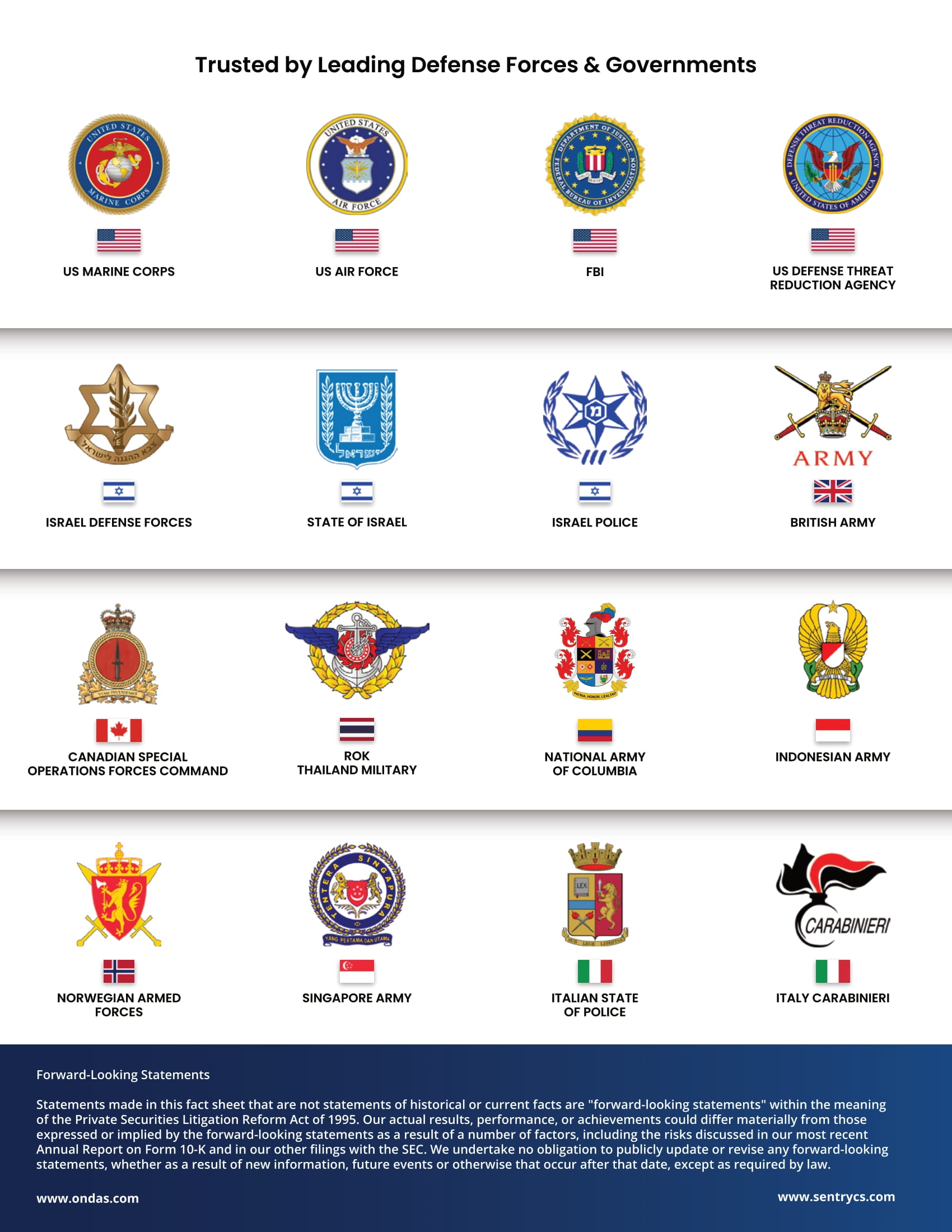 Forward - Looking Statements Statements made in this fact sheet that are not statements of historical or current facts are "forward - looking statements" within the meaning of the Private Securities Litigation Reform Act of 1995. Our actual results, performance, or achievements could differ materially from those expressed or implied by the forward - looking statements as a result of a number of factors, including the risks discussed in our most recent Annual Report on Form 10 - K and in our other filings with the SEC. We undertake no obligation to publicly update or revise any forward - looking statements, whether as a result of new information, future events or otherwise that occur after that date, except as required by law. www.sentrycs.com www.ondas.com Trusted by Leading Defense Forces & Governments CANADIAN SPECIAL OPERATIONS FORCES COMMAND ROK THAILAND MILITARY NATIONAL ARMY OF COLUMBIA INDONESIAN ARMY US MARINE CORPS US AIR FORCE FBI US DEFENSE THREAT REDUCTION AGENCY ISRAEL DEFENSE FORCES STATE OF ISRAEL ISRAEL POLICE BRITISH ARMY NORWEGIAN ARMED FORCES SINGAPORE ARMY ITALIAN STATE OF POLICE ITALY CARABINIERI