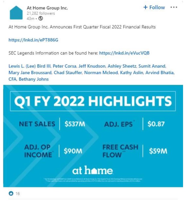 The following communication was made available by At Home Group Inc., a Delaware corporation (“At Home” or the “Company”), on its LinkedIn account on June 3, 2021.