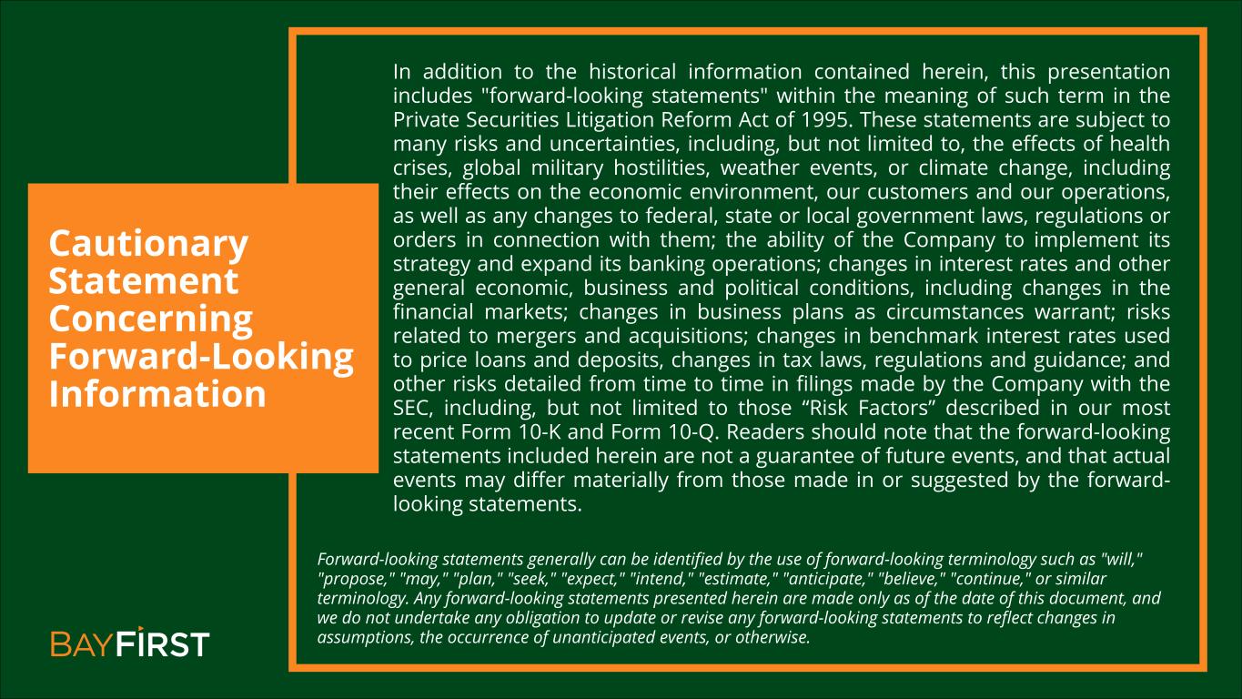 In addition to the historical information contained herein, this presentation includes "forward-looking statements" within the meaning of such term in the Private Securities Litigation Reform Act of 1995. These statements are subject to many risks and uncertainties, including, but not limited to, the effects of health crises, global military hostilities, weather events, or climate change, including their effects on the economic environment, our customers and our operations, as well as any changes to federal, state or local government laws, regulations or orders in connection with them; the ability of the Company to implement its strategy and expand its banking operations; changes in interest rates and other general economic, business and political conditions, including changes in the financial markets; changes in business plans as circumstances warrant; risks related to mergers and acquisitions; changes in benchmark interest rates used to price loans and deposits, changes in tax laws, regulations and guidance; and other risks detailed from time to time in filings made by the Company with the SEC, including, but not limited to those “Risk Factors” described in our most recent Form 10-K and Form 10-Q. Readers should note that the forward-looking statements included herein are not a guarantee of future events, and that actual events may differ materially from those made in or suggested by the forward- looking statements. Cautionary Statement Concerning Forward-Looking Information Forward-looking statements generally can be identified by the use of forward-looking terminology such as "will," "propose," "may," "plan," "seek," "expect," "intend," "estimate," "anticipate," "believe," "continue," or similar terminology. Any forward-looking statements presented herein are made only as of the date of this document, and we do not undertake any obligation to update or revise any forward-looking statements to reflect changes in assumptions, the occurrence of unanticipated events, or otherwise.
