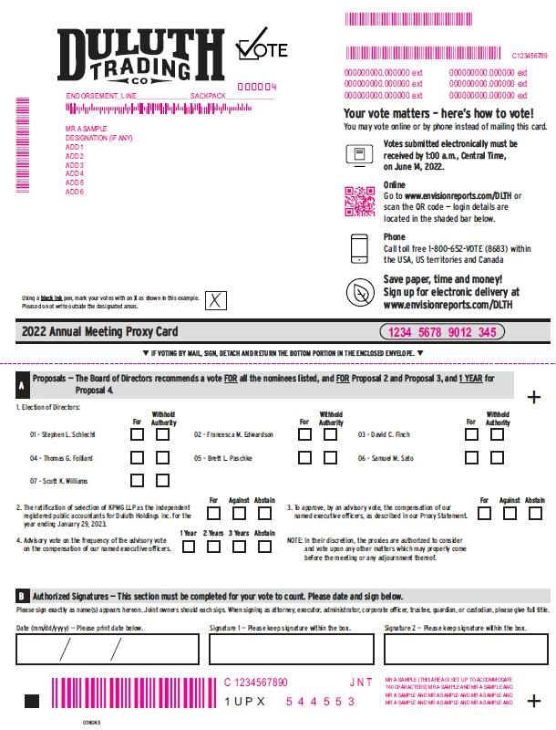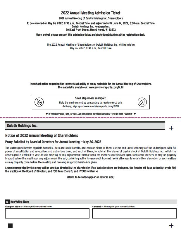 Important Notice Regarding the Availability of Proxy Materials for the Annual Meeting of Shareholders to be held on May 26, 2022: The annual report to shareholders and proxy statement of Duluth Holdings Inc. are available for review at www.envisionreports.com/DLTH. Instructions on how to access and review the materials on the Internet can be found on the Notice and the accompanying proxy card.