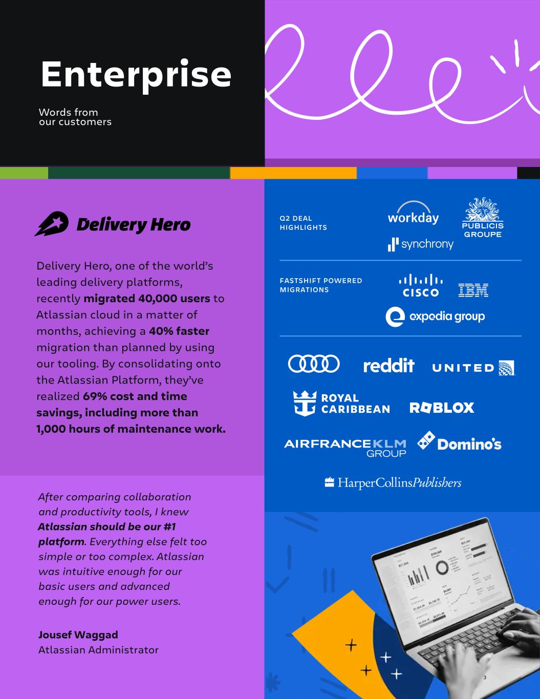 Q2 FY26 Enterprise After comparing collaboration and productivity tools, I knew Atlassian should be our #1 platform. Everything else felt too simple or too complex. Atlassian was intuitive enough for our basic users and advanced enough for our power users. Jousef Waggad Atlassian Administrator Delivery Hero, one of the world’s leading delivery platforms, recently migrated 40,000 users to Atlassian cloud in a matter of months, achieving a 40% faster migration than planned by using our tooling. By consolidating onto the Atlassian Platform, they’ve realized 69% cost and time savings, including more than 1,000 hours of maintenance work. Q2 DEAL HIGHLIGHTS FASTSHIFT POWERED MIGRATIONS Words from our customers 3
