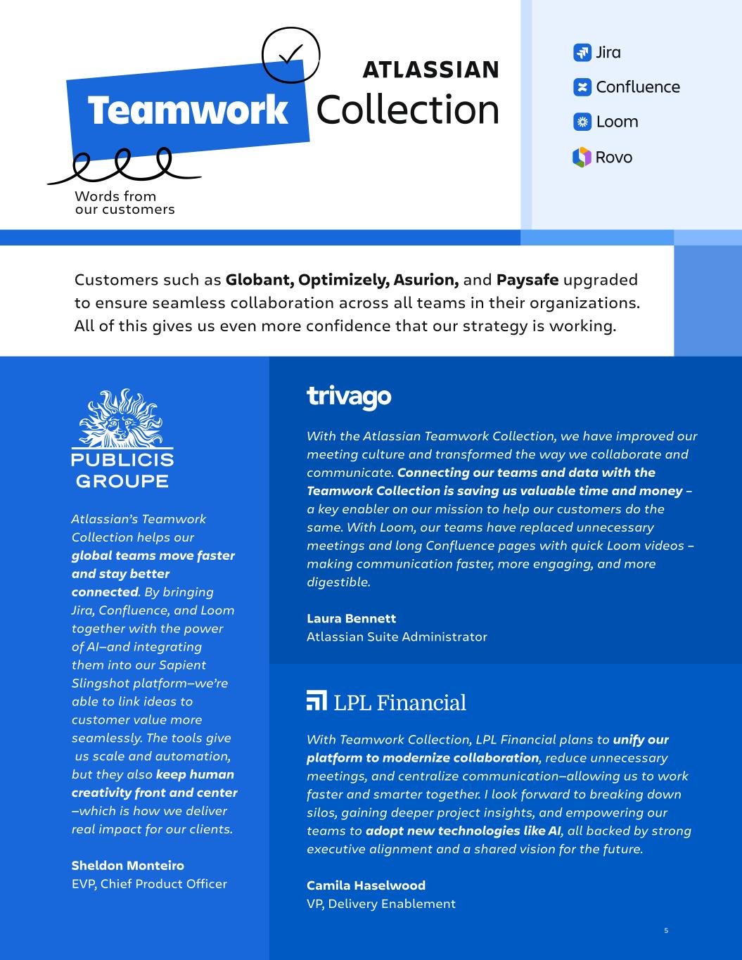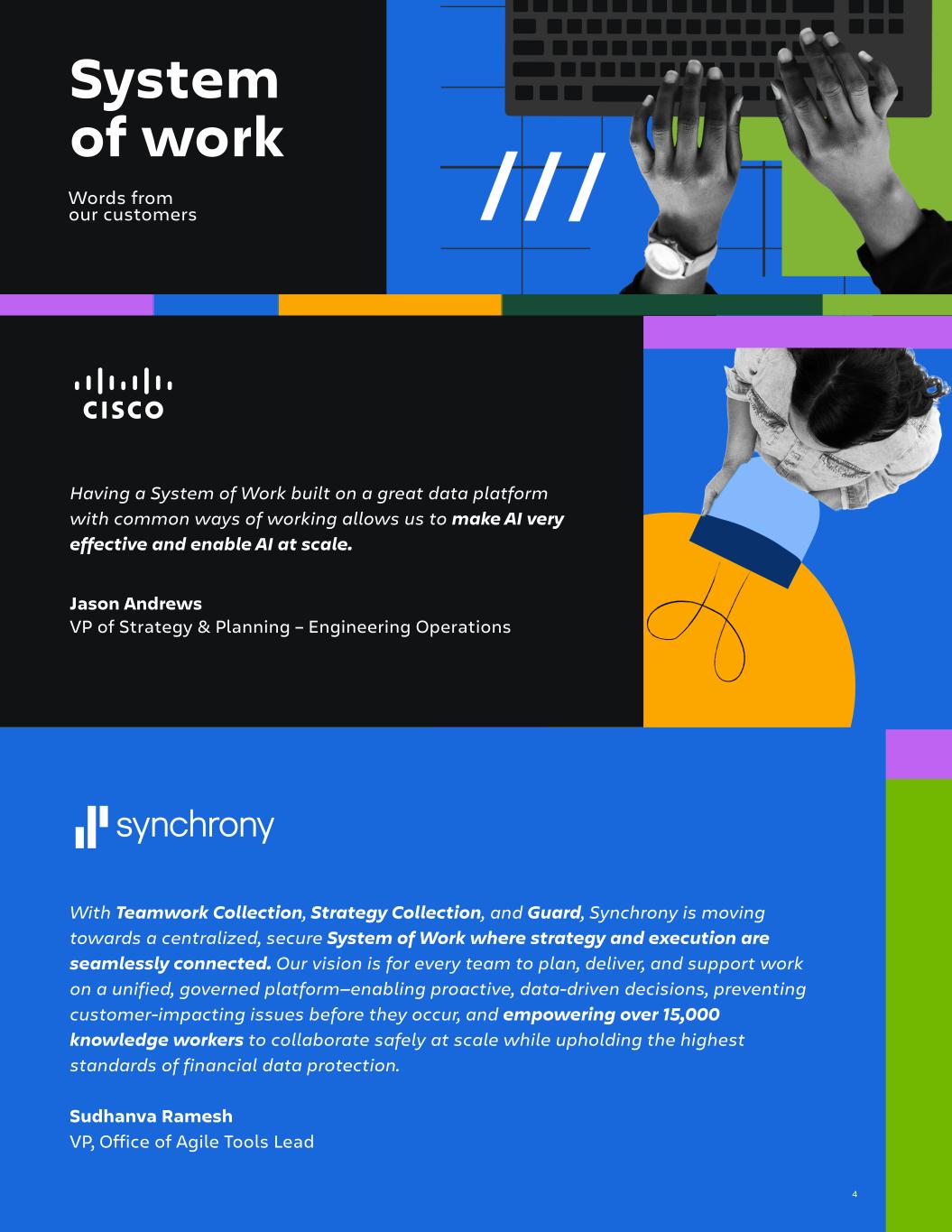 Q2 FY26 System of work With Teamwork Collection, Strategy Collection, and Guard, Synchrony is moving towards a centralized, secure System of Work where strategy and execution are seamlessly connected. Our vision is for every team to plan, deliver, and support work on a unified, governed platform—enabling proactive, data-driven decisions, preventing customer-impacting issues before they occur, and empowering over 15,000 knowledge workers to collaborate safely at scale while upholding the highest standards of financial data protection. Sudhanva Ramesh VP, Office of Agile Tools Lead Having a System of Work built on a great data platform with common ways of working allows us to make AI very effective and enable AI at scale. Jason Andrews VP of Strategy & Planning – Engineering Operations Words from our customers 4
