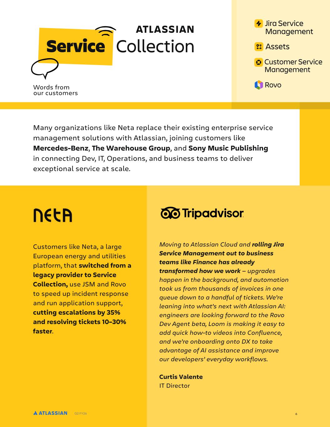 Q2 FY26 6 Moving to Atlassian Cloud and rolling Jira Service Management out to business teams like Finance has already transformed how we work — upgrades happen in the background, and automation took us from thousands of invoices in one queue down to a handful of tickets. We’re leaning into what’s next with Atlassian AI: engineers are looking forward to the Rovo Dev Agent beta, Loom is making it easy to add quick how‑to videos into Confluence, and we’re onboarding onto DX to take advantage of AI assistance and improve our developers’ everyday workflows. Curtis Valente IT Director Many organizations like Neta replace their existing enterprise service management solutions with Atlassian, joining customers like Mercedes-Benz, The Warehouse Group, and Sony Music Publishing in connecting Dev, IT, Operations, and business teams to deliver exceptional service at scale. Customers like Neta, a large European energy and utilities platform, that switched from a legacy provider to Service Collection, use JSM and Rovo to speed up incident response and run application support, cutting escalations by 35% and resolving tickets 10–30% faster. Words from our customers