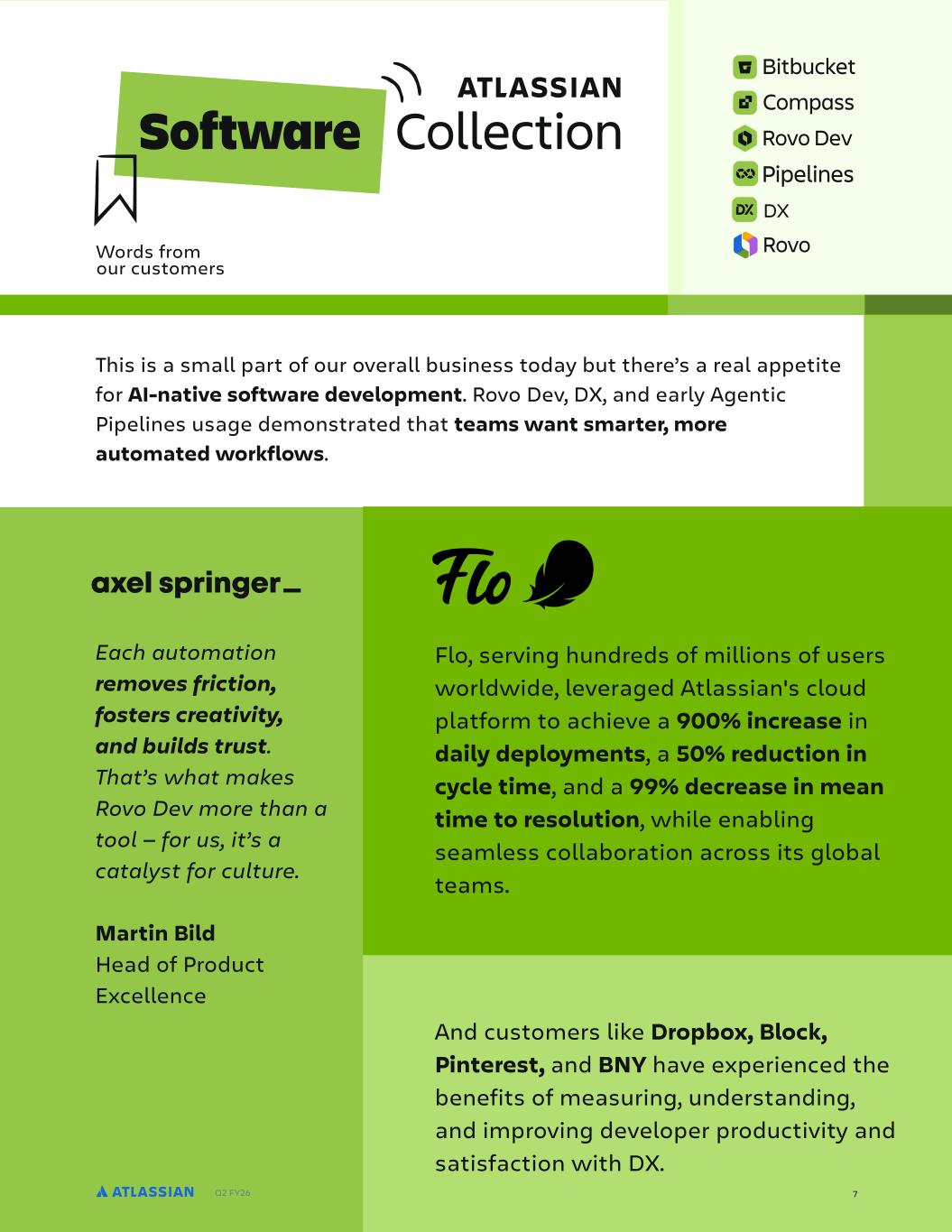 Q2 FY26 Each automation removes friction, fosters creativity, and builds trust. That’s what makes Rovo Dev more than a tool — for us, it’s a catalyst for culture. Martin Bild Head of Product Excellence This is a small part of our overall business today but there’s a real appetite for AI-native software development. Rovo Dev, DX, and early Agentic Pipelines usage demonstrated that teams want smarter, more automated workflows. Flo, serving hundreds of millions of users worldwide, leveraged Atlassian's cloud platform to achieve a 900% increase in daily deployments, a 50% reduction in cycle time, and a 99% decrease in mean time to resolution, while enabling seamless collaboration across its global teams. And customers like Dropbox, Block, Pinterest, and BNY have experienced the benefits of measuring, understanding, and improving developer productivity and satisfaction with DX. Words from our customers DX 7