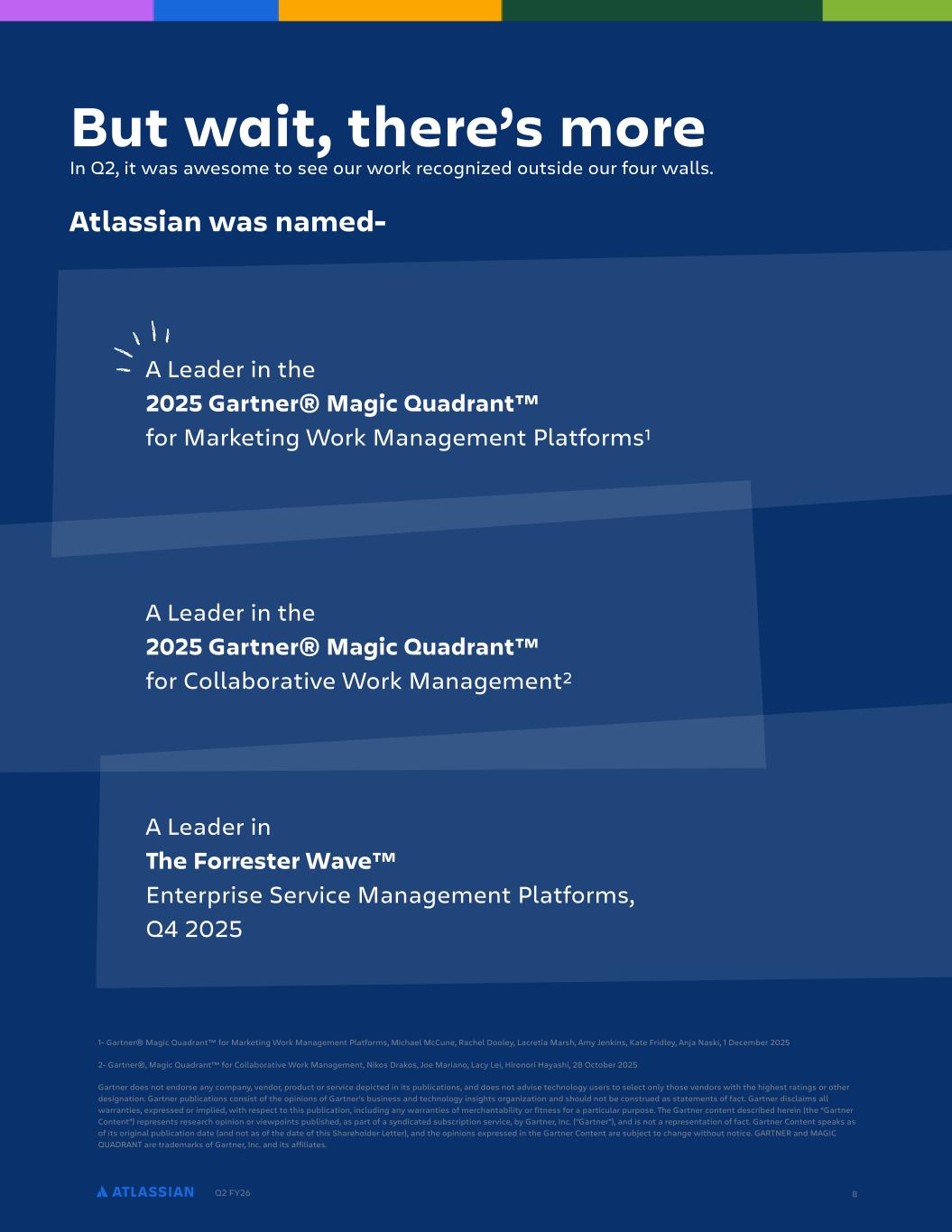 Q2 FY26 8 A Leader in the 2025 Gartner® Magic Quadrant™ for Collaborative Work Management2 A Leader in The Forrester Wave™ Enterprise Service Management Platforms, Q4 2025 A Leader in the 2025 Gartner® Magic Quadrant™ for Marketing Work Management Platforms1 1- Gartner® Magic Quadrant™ for Marketing Work Management Platforms, Michael McCune, Rachel Dooley, Lacretia Marsh, Amy Jenkins, Kate Fridley, Anja Naski, 1 December 2025 2- Gartner®, Magic Quadrant™ for Collaborative Work Management, Nikos Drakos, Joe Mariano, Lacy Lei, Hironori Hayashi, 28 October 2025 Gartner does not endorse any company, vendor, product or service depicted in its publications, and does not advise technology users to select only those vendors with the highest ratings or other designation. Gartner publications consist of the opinions of Gartner’s business and technology insights organization and should not be construed as statements of fact. Gartner disclaims all warranties, expressed or implied, with respect to this publication, including any warranties of merchantability or fitness for a particular purpose. The Gartner content described herein (the “Gartner Content”) represents research opinion or viewpoints published, as part of a syndicated subscription service, by Gartner, Inc. ("Gartner"), and is not a representation of fact. Gartner Content speaks as of its original publication date (and not as of the date of this Shareholder Letter), and the opinions expressed in the Gartner Content are subject to change without notice. GARTNER and MAGIC QUADRANT are trademarks of Gartner, Inc. and its affiliates. But wait, there’s more In Q2, it was awesome to see our work recognized outside our four walls. Atlassian was named-
