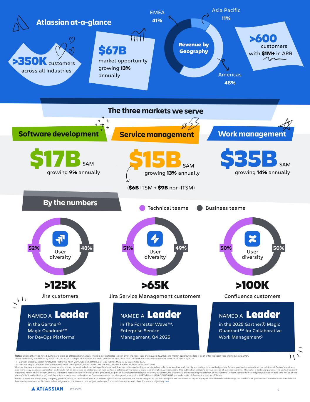 Q2 FY26 9 Confluence customers >100K Jira Service Management customers >65K in the Gartner® Magic Quadrant™ for DevOps Platforms1 LeaderNAMED A in The Forrester Wave™: Enterprise Service Management, Q4 2025 LeaderNAMED A 52% 48% Jira customers >125K Technical teams Business teams 51% 49% 50% 50% Atlassian at-a-glance The three markets we serve $67B market opportunity growing 13% annually across all industries >350K customers >600 customers with $1M+ in ARR Americas 48% EMEA 41% Asia Pacific 11% Revenue by Geography Notes: Unless otherwise noted, customer data is as of December 31, 2025, financial data reflected is as of or for the fiscal year ending June 30, 2025, and market opportunity data is as of or for the fiscal year ending June 30, 2024. The user diversity breakdown by product is based on a sample of 5 million+ Jira and Confluence Cloud users and 1 million+ Jira Service Management users as of March 31, 2024. 1 — Gartner, Magic Quadrant for DevOps Platforms, Keith Mann, George Spafford, Bill Holz, Thomas Murphy, 22 September 2025. 2 — Gartner, Magic Quadrant for Collaborative Work Management, Nikos Drakos, Joe Mariano, Lacy Lei, Hironori Hayashi, 28 October 2025 Gartner does not endorse any company, vendor, product or service depicted in its publications, and does not advise technology users to select only those vendors with the highest ratings or other designation. Gartner publications consist of the opinions of Gartner’s business and technology insights organization and should not be construed as statements of fact. Gartner disclaims all warranties, expressed or implied, with respect to this publication, including any warranties of merchantability or fitness for a particular purpose. The Gartner content described herein (the “Gartner Content”) represents research opinion or viewpoints published, as part of a syndicated subscription service, by Gartner, Inc. ("Gartner"), and is not a representation of fact. Gartner Content speaks as of its original publication date (and not as of the date of this Shareholder Letter), and the opinions expressed in the Gartner Content are subject to change without notice. GARTNER and MAGIC QUADRANT are trademarks of Gartner, Inc. and its affiliates. Forrester does not endorse any company, product, brand, or service included in its research publications and does not advise any person to select the products or services of any company or brand based on the ratings included in such publications. Information is based on the best available resources. Opinions reflect judgment at the time and are subject to change. For more information, read about Forrester’s objectivity here . User diversity User diversity User diversity Software development growing 9% annually $17B SAM Work management growing 14% annually $35B SAM Service management growing 13% annually $15B SAM ($6B ITSM + $9B non-ITSM) By the numbers in the 2025 Gartner® Magic Quadrant™ for Collaborative Work Management2 LeaderNAMED A