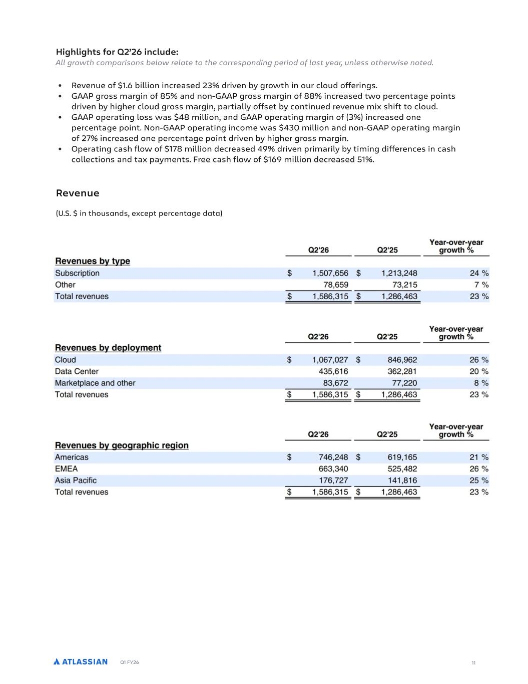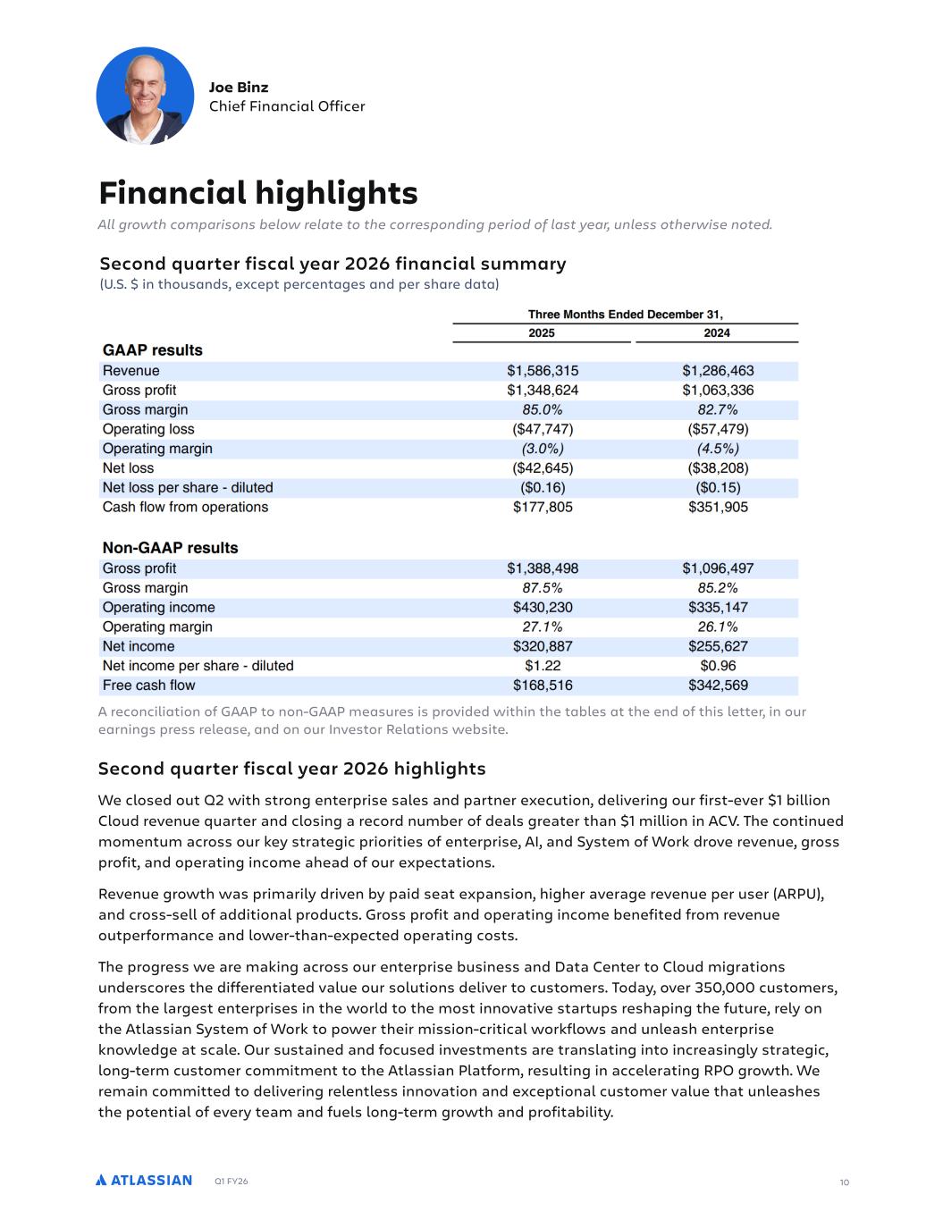 Q1 FY26 10 A reconciliation of GAAP to non-GAAP measures is provided within the tables at the end of this letter, in our earnings press release, and on our Investor Relations website. Joe Binz Chief Financial Officer Financial highlights All growth comparisons below relate to the corresponding period of last year, unless otherwise noted. Second quarter fiscal year 2026 highlights We closed out Q2 with strong enterprise sales and partner execution, delivering our first-ever $1 billion Cloud revenue quarter and closing a record number of deals greater than $1 million in ACV. The continued momentum across our key strategic priorities of enterprise, AI, and System of Work drove revenue, gross profit, and operating income ahead of our expectations. Revenue growth was primarily driven by paid seat expansion, higher average revenue per user (ARPU), and cross-sell of additional products. Gross profit and operating income benefited from revenue outperformance and lower-than-expected operating costs. The progress we are making across our enterprise business and Data Center to Cloud migrations underscores the differentiated value our solutions deliver to customers. Today, over 350,000 customers, from the largest enterprises in the world to the most innovative startups reshaping the future, rely on the Atlassian System of Work to power their mission-critical workflows and unleash enterprise knowledge at scale. Our sustained and focused investments are translating into increasingly strategic, long-term customer commitment to the Atlassian Platform, resulting in accelerating RPO growth. We remain committed to delivering relentless innovation and exceptional customer value that unleashes the potential of every team and fuels long-term growth and profitability. Second quarter fiscal year 2026 financial summary (U.S. $ in thousands, except percentages and per share data)