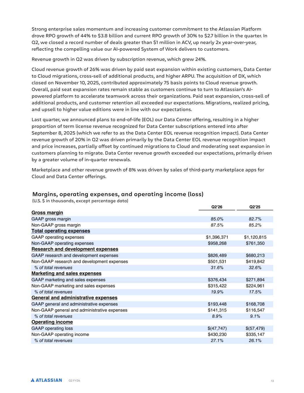 Q2 FY26 13 Strong enterprise sales momentum and increasing customer commitment to the Atlassian Platform drove RPO growth of 44% to $3.8 billion and current RPO growth of 30% to $2.7 billion in the quarter. In Q2, we closed a record number of deals greater than $1 million in ACV, up nearly 2x year-over-year, reflecting the compelling value our AI-powered System of Work delivers to customers. Revenue growth in Q2 was driven by subscription revenue, which grew 24%. Cloud revenue growth of 26% was driven by paid seat expansion within existing customers, Data Center to Cloud migrations, cross-sell of additional products, and higher ARPU. The acquisition of DX, which closed on November 10, 2025, contributed approximately 75 basis points to Cloud revenue growth. Overall, paid seat expansion rates remain stable as customers continue to turn to Atlassian’s AI- powered platform to accelerate teamwork across their organizations. Paid seat expansion, cross-sell of additional products, and customer retention all exceeded our expectations. Migrations, realized pricing, and upsell to higher value editions were in line with our expectations. Last quarter, we announced plans to end-of-life (EOL) our Data Center offering, resulting in a higher proportion of term license revenue recognized for Data Center subscriptions entered into after September 8, 2025 (which we refer to as the Data Center EOL revenue recognition impact). Data Center revenue growth of 20% in Q2 was driven primarily by the Data Center EOL revenue recognition impact and price increases, partially offset by continued migrations to Cloud and moderating seat expansion in customers planning to migrate. Data Center revenue growth exceeded our expectations, primarily driven by a greater volume of in-quarter renewals. Marketplace and other revenue growth of 8% was driven by sales of third-party marketplace apps for Cloud and Data Center offerings. Margins, operating expenses, and operating income (loss) (U.S. $ in thousands, except percentage data)