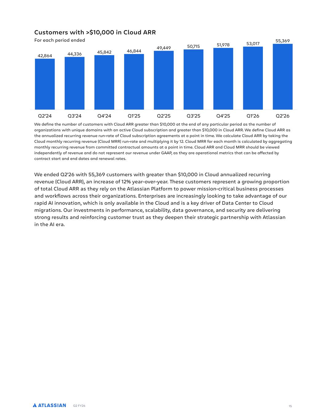 Q2 FY26 Q2 FY26 16 We define the number of customers with Cloud ARR greater than $10,000 at the end of any particular period as the number of organizations with unique domains with an active Cloud subscription and greater than $10,000 in Cloud ARR. We define Cloud ARR as the annualized recurring revenue run-rate of Cloud subscription agreements at a point in time. We calculate Cloud ARR by taking the Cloud monthly recurring revenue (Cloud MRR) run-rate and multiplying it by 12. Cloud MRR for each month is calculated by aggregating monthly recurring revenue from committed contractual amounts at a point in time. Cloud ARR and Cloud MRR should be viewed independently of revenue and do not represent our revenue under GAAP, as they are operational metrics that can be affected by contract start and end dates and renewal rates. Q2’24 Q3’24 Q4’24 Q1’25 Q2’25 Q3’25 Q4’25 Q1’26 Q2’26 55,36953,01751,97850,71549,44946,84445,84244,33642,864 Customers with >$10,000 in Cloud ARR For each period ended We ended Q2’26 with 55,369 customers with greater than $10,000 in Cloud annualized recurring revenue (Cloud ARR), an increase of 12% year-over-year. These customers represent a growing proportion of total Cloud ARR as they rely on the Atlassian Platform to power mission-critical business processes and workflows across their organizations. Enterprises are increasingly looking to take advantage of our rapid AI innovation, which is only available in the Cloud and is a key driver of Data Center to Cloud migrations. Our investments in performance, scalability, data governance, and security are delivering strong results and reinforcing customer trust as they deepen their strategic partnership with Atlassian in the AI era. 15