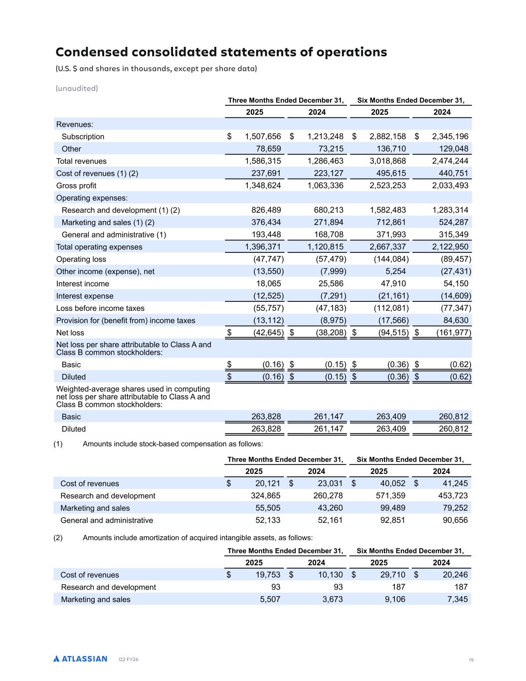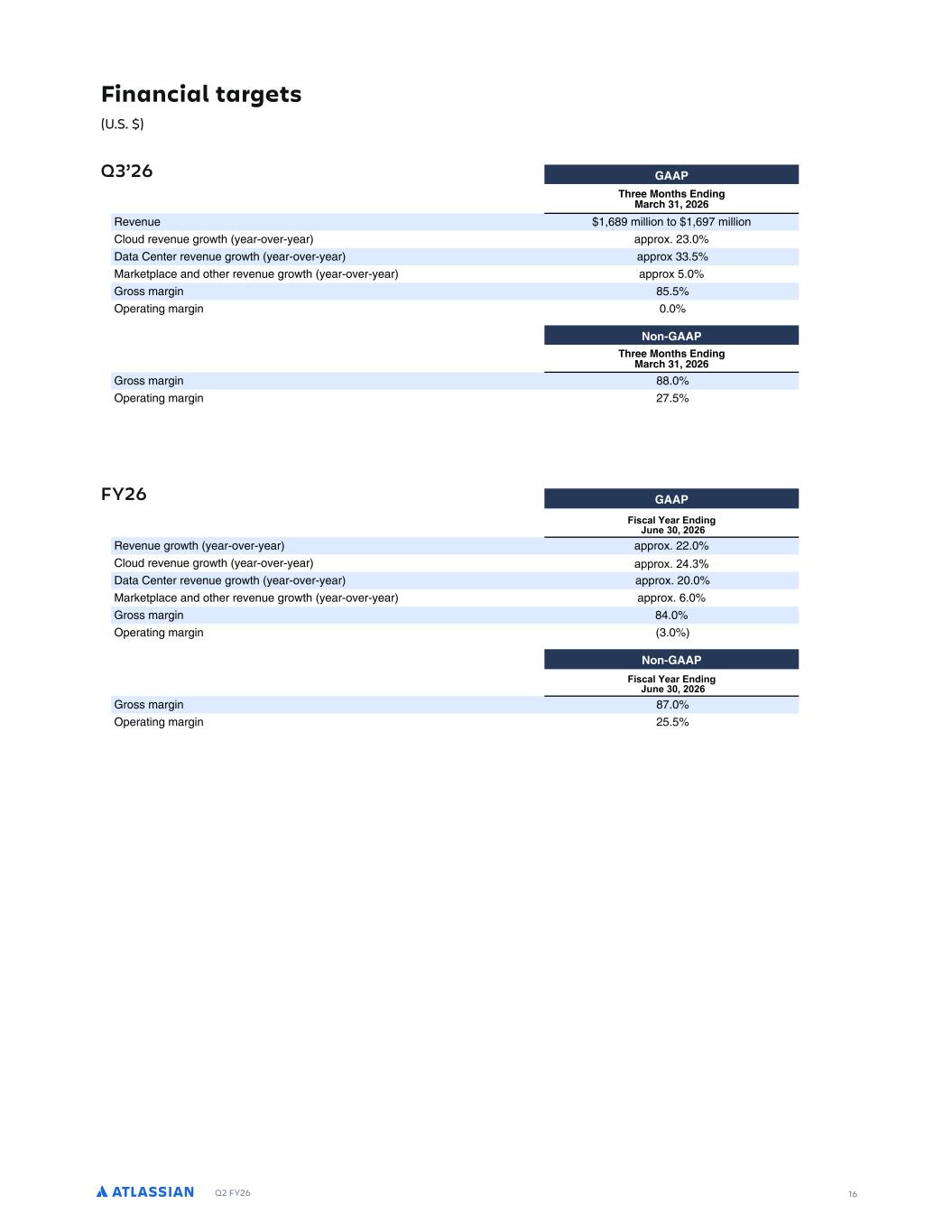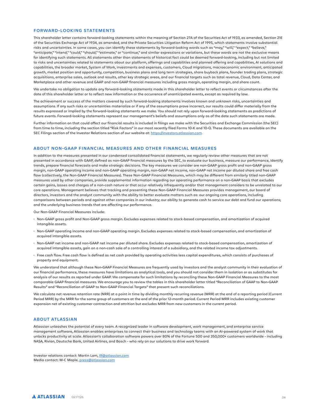 Q2 FY26 24 FORWARD-LOOKING STATEMENTS This shareholder letter contains forward-looking statements within the meaning of Section 27A of the Securities Act of 1933, as amended, Section 21E of the Securities Exchange Act of 1934, as amended, and the Private Securities Litigation Reform Act of 1995, which statements involve substantial risks and uncertainties. In some cases, you can identify these statements by forward-looking words such as “may,” “will,” “expect,” “believe,” “anticipate,” “intend,” “could,” “should,” “estimate,” or “continue,” and similar expressions or variations, but these words are not the exclusive means for identifying such statements. All statements other than statements of historical fact could be deemed forward-looking, including but not limited to risks and uncertainties related to statements about our platform, offerings and capabilities and planned offering and capabilities, AI solutions and capabilities, the broader market, System of Work, investments and expenses, customers, Cloud migrations, macroeconomic environment, anticipated growth, market position and opportunity, competition, business plans and long term strategies, share buyback plans, founder trading plans, strategic acquisitions, enterprise sales, outlook and results, other key strategic areas, and our financial targets such as total revenue, Cloud, Data Center, and Marketplace and other revenue and GAAP and non-GAAP financial measures including gross margin, operating margin, and share count. We undertake no obligation to update any forward-looking statements made in this shareholder letter to reflect events or circumstances after the date of this shareholder letter or to reflect new information or the occurrence of unanticipated events, except as required by law. The achievement or success of the matters covered by such forward-looking statements involves known and unknown risks, uncertainties and assumptions. If any such risks or uncertainties materialize or if any of the assumptions prove incorrect, our results could differ materially from the results expressed or implied by the forward-looking statements we make. You should not rely upon forward-looking statements as predictions of future events. Forward-looking statements represent our management’s beliefs and assumptions only as of the date such statements are made. Further information on that could affect our financial results is included in filings we make with the Securities and Exchange Commission (the SEC) from time to time, including the section titled “Risk Factors” in our most recently filed Forms 10-K and 10-Q. These documents are available on the SEC Filings section of the Investor Relations section of our website at: https://investors.atlassian.com. ABOUT NON-GAAP FINANCIAL MEASURES AND OTHER FINANCIAL MEASURES In addition to the measures presented in our condensed consolidated financial statements, we regularly review other measures that are not presented in accordance with GAAP, defined as non-GAAP financial measures by the SEC, to evaluate our business, measure our performance, identify trends, prepare financial forecasts and make strategic decisions. The key measures we consider are non-GAAP gross profit and non-GAAP gross margin, non-GAAP operating income and non-GAAP operating margin, non-GAAP net income, non-GAAP net income per diluted share and free cash flow (collectively, the Non-GAAP Financial Measures). These Non-GAAP Financial Measures, which may be different from similarly titled non-GAAP measures used by other companies, provide supplemental information regarding our operating performance on a non-GAAP basis that excludes certain gains, losses and charges of a non-cash nature or that occur relatively infrequently and/or that management considers to be unrelated to our core operations. Management believes that tracking and presenting these Non-GAAP Financial Measures provides management, our board of directors, investors and the analyst community with the ability to better evaluate matters such as: our ongoing core operations, including comparisons between periods and against other companies in our industry; our ability to generate cash to service our debt and fund our operations; and the underlying business trends that are affecting our performance. Our Non-GAAP Financial Measures include: • Non-GAAP gross profit and Non-GAAP gross margin. Excludes expenses related to stock-based compensation, and amortization of acquired intangible assets. • Non-GAAP operating income and non-GAAP operating margin. Excludes expenses related to stock-based compensation, and amortization of acquired intangible assets. • Non-GAAP net income and non-GAAP net income per diluted share. Excludes expenses related to stock-based compensation, amortization of acquired intangible assets, gain on a non-cash sale of a controlling interest of a subsidiary, and the related income tax adjustments. • Free cash flow. Free cash flow is defined as net cash provided by operating activities less capital expenditures, which consists of purchases of property and equipment. We understand that although these Non-GAAP Financial Measures are frequently used by investors and the analyst community in their evaluation of our financial performance, these measures have limitations as analytical tools, and you should not consider them in isolation or as substitutes for analysis of our results as reported under GAAP. We compensate for such limitations by reconciling these Non-GAAP Financial Measures to the most comparable GAAP financial measures. We encourage you to review the tables in this shareholder letter titled “Reconciliation of GAAP to Non-GAAP Results” and “Reconciliation of GAAP to Non-GAAP Financial Targets” that present such reconciliations. We calculate net revenue retention rate (NRR) at a point in time by dividing monthly recurring revenue (MRR) at the end of a reporting period (Current Period