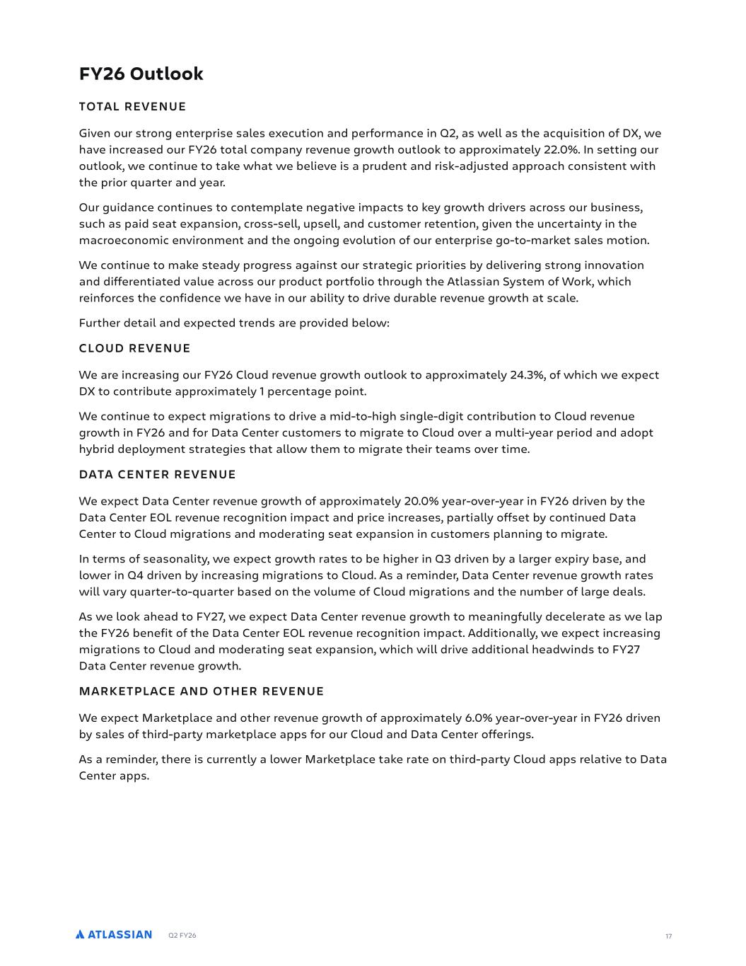 Q2 FY26 17 FY26 Outlook TOTAL REVENUE Given our strong enterprise sales execution and performance in Q2, as well as the acquisition of DX, we have increased our FY26 total company revenue growth outlook to approximately 22.0%. In setting our outlook, we continue to take what we believe is a prudent and risk-adjusted approach consistent with the prior quarter and year. Our guidance continues to contemplate negative impacts to key growth drivers across our business, such as paid seat expansion, cross-sell, upsell, and customer retention, given the uncertainty in the macroeconomic environment and the ongoing evolution of our enterprise go-to-market sales motion. We continue to make steady progress against our strategic priorities by delivering strong innovation and differentiated value across our product portfolio through the Atlassian System of Work, which reinforces the confidence we have in our ability to drive durable revenue growth at scale. Further detail and expected trends are provided below: CLOUD REVENUE We are increasing our FY26 Cloud revenue growth outlook to approximately 24.3%, of which we expect DX to contribute approximately 1 percentage point. We continue to expect migrations to drive a mid-to-high single-digit contribution to Cloud revenue growth in FY26 and for Data Center customers to migrate to Cloud over a multi-year period and adopt hybrid deployment strategies that allow them to migrate their teams over time. DATA CENTER REVENUE We expect Data Center revenue growth of approximately 20.0% year-over-year in FY26 driven by the Data Center EOL revenue recognition impact and price increases, partially offset by continued Data Center to Cloud migrations and moderating seat expansion in customers planning to migrate. In terms of seasonality, we expect growth rates to be higher in Q3 driven by a larger expiry base, and lower in Q4 driven by increasing migrations to Cloud. As a reminder, Data Center revenue growth rates will vary quarter-to-quarter based on the volume of Cloud migrations and the number of large deals. As we look ahead to FY27, we expect Data Center revenue growth to meaningfully decelerate as we lap the FY26 benefit of the Data Center EOL revenue recognition impact. Additionally, we expect increasing migrations to Cloud and moderating seat expansion, which will drive additional headwinds to FY27 Data Center revenue growth. MARKETPLACE AND OTHER REVENUE We expect Marketplace and other revenue growth of approximately 6.0% year-over-year in FY26 driven by sales of third-party marketplace apps for our Cloud and Data Center offerings. As a reminder, there is currently a lower Marketplace take rate on third-party Cloud apps relative to Data Center apps.