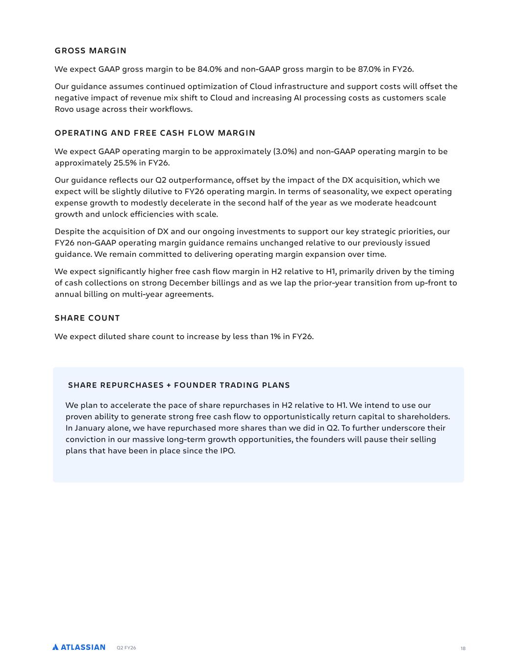 Q2 FY26 GROSS MARGIN We expect GAAP gross margin to be 84.0% and non-GAAP gross margin to be 87.0% in FY26. Our guidance assumes continued optimization of Cloud infrastructure and support costs will offset the negative impact of revenue mix shift to Cloud and increasing AI processing costs as customers scale Rovo usage across their workflows. OPERATING AND FREE CASH FLOW MARGIN We expect GAAP operating margin to be approximately (3.0%) and non-GAAP operating margin to be approximately 25.5% in FY26. Our guidance reflects our Q2 outperformance, offset by the impact of the DX acquisition, which we expect will be slightly dilutive to FY26 operating margin. In terms of seasonality, we expect operating expense growth to modestly decelerate in the second half of the year as we moderate headcount growth and unlock efficiencies with scale. Despite the acquisition of DX and our ongoing investments to support our key strategic priorities, our FY26 non-GAAP operating margin guidance remains unchanged relative to our previously issued guidance. We remain committed to delivering operating margin expansion over time. We expect significantly higher free cash flow margin in H2 relative to H1, primarily driven by the timing of cash collections on strong December billings and as we lap the prior-year transition from up-front to annual billing on multi-year agreements. SHARE COUNT We expect diluted share count to increase by less than 1% in FY26. 18 We plan to accelerate the pace of share repurchases in H2 relative to H1. We intend to use our proven ability to generate strong free cash flow to opportunistically return capital to shareholders. In January alone, we have repurchased more shares than we did in Q2. To further underscore their conviction in our massive long-term growth opportunities, the founders will pause their selling plans that have been in place since the IPO. SHARE REPURCHASES + FOUNDER TRADING PLANS