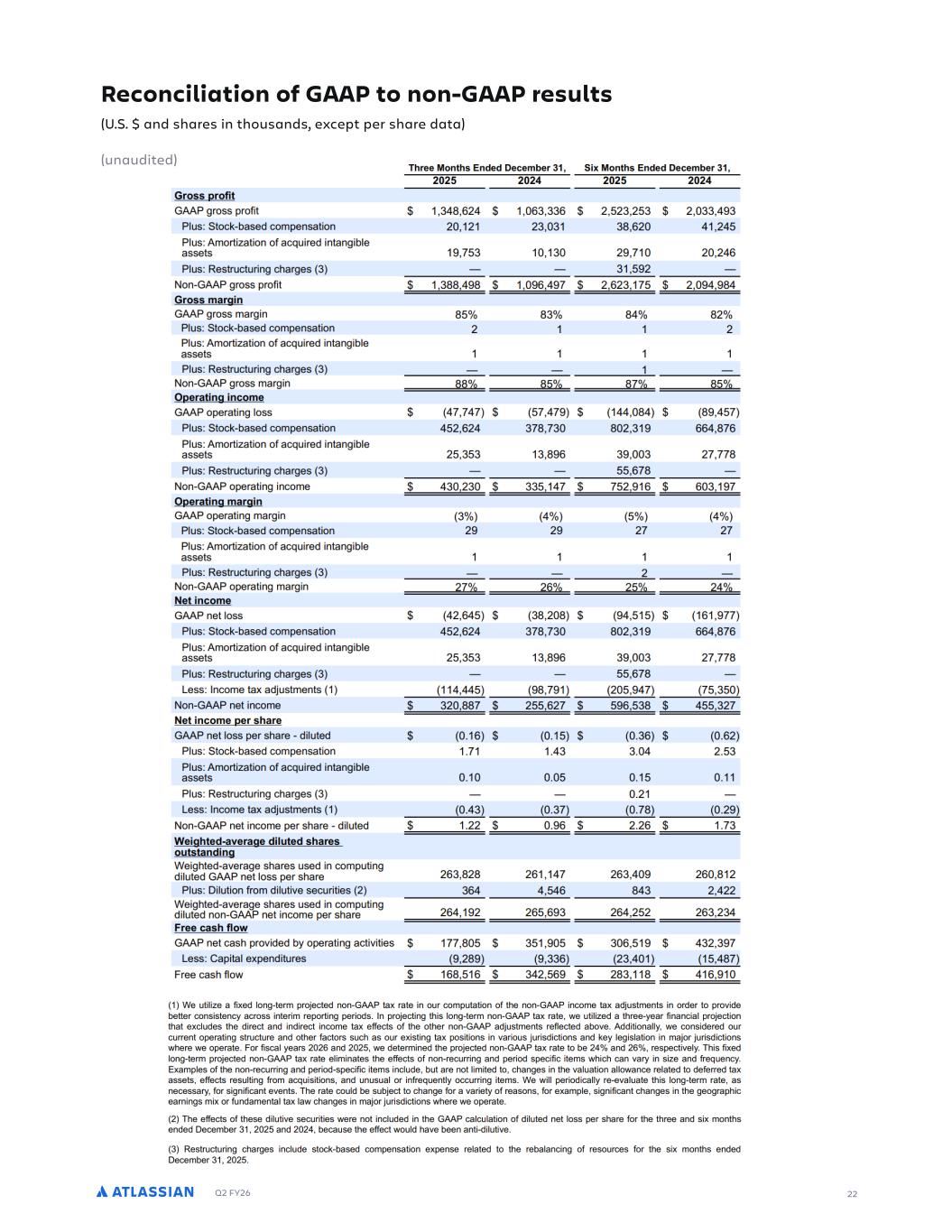 Q2 FY26 23 ATLASSIAN CORPORATION Reconciliation of GAAP to non-GAAP financial targets 0UMCTT CO 2PS PSCU PO GEPOE M CU PO P 600 UP :PO$600 5 OCOE CM CS GUT JSGG POUJT 4OF O CSEJ ) ( (, 600 SPTT NCS O . % M T0 PDL$CBTFE DPN FOTB PO % M T0 1NPS B PO PG BDR SFE O BO CMF BTTF T % :PO$600 SPTT NCS O ..% 600 P GSCU O NCS O % M T0 PDL$CBTFE DPN FOTB PO ( % M T0 1NPS B PO PG BDR SFE O BO CMF BTTF T (% :PO$600 P GSCU O NCS O (-% 5 TECM BGCS 4OF O 7 OG ) ( (, 600 SPTT NCS O . % M T0 PDL$CBTFE DPN FOTB PO %( M T0 1NPS B PO PG BDR SFE O BO CMF BTTF T %) M T0 FT S D S O 3IBS FT % :PO$600 SPTT NCS O .-% 600 P GSCU O NCS O )% M T0 PDL$CBTFE DPN FOTB PO (,% M T0 1NPS B PO PG BDR SFE O BO CMF BTTF T % M T0 FT S D S O 3IBS FT % :PO$600 P GSCU O NCS O ( % (
