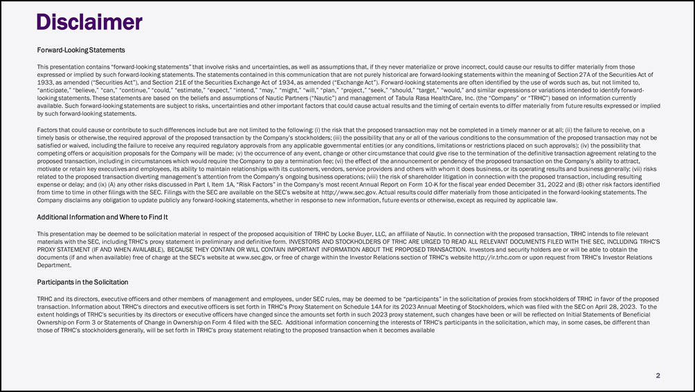 Information and Where to Find It This presentation may be deemed to be solicitation material in respect of the proposed acquisition of TRHC by Locke Buyer, LLC, an affiliate of Nautic. In connection with the proposed transaction, TRHC intends