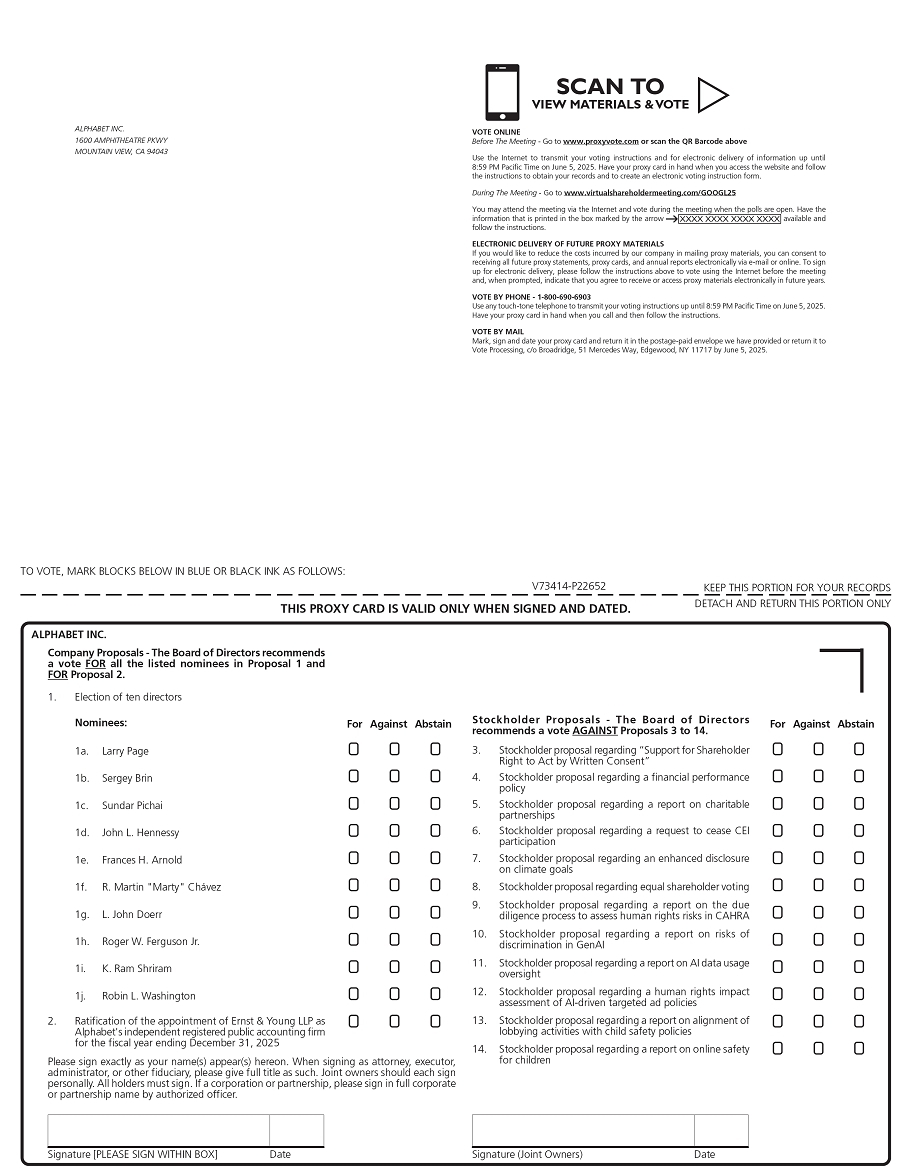 SCAN TO VIEW MATERIALS & VOTE ALPHABET INC. 1600 AMPHITHEATRE PKWY MOUNTAIN VIEW, CA 94043 VOTE ONLINE Before The Meeting - Go to www.proxyvote.com or scan the QR Barcode above Use the Internet to transmit your voting instructions and for electronic delivery of information up until 8:59 PM Pacific Time on June 5, 2025. Have your proxy card in hand when you access the website and follow the instructions to obtain your records and to create an electronic voting instruction form. During The Meeting - Go to www.virtualshareholdermeeting.com/GOOGL25 You may attend the meeting via the Internet and vote during the meeting when the polls are open. Have the information that is printed in the box marked by the arrow XXXX XXXX XXXX XXXX available and follow the instructions. ELECTRONIC DELIVERY OF FUTURE PROXY MATERIALS If you would like to reduce the costs incurred by our company in mailing proxy materials, you can consent to receiving all future proxy statements, proxy cards, and annual reports electronically via e-mail or online. To sign up for electronic delivery, please follow the instructions above to vote using the Internet before the meeting and, when prompted, indicate that you agree to receive or access proxy materials electronically in future years. VOTE BY PHONE - 1-800-690-6903 Use any touch-tone telephone to transmit your voting instructions up until 8:59 PM Pacific Time on June 5, 2025. Have your proxy card in hand when you call and then follow the instructions. VOTE BY MAIL Mark, sign and date your proxy card and return it in the postage-paid envelope we have provided or return it to Vote Processing, c/o Broadridge, 51 Mercedes Way, Edgewood, NY 11717 by June 5, 2025. TO VOTE, MARK BLOCKS BELOW IN BLUE OR BLACK INK AS FOLLOWS: V73414-P22652 KEEP THIS PORTION FOR YOUR RECORDS THIS PROXY CARD IS VALID ONLY WHEN SIGNED AND DATED. DETACH AND RETURN THIS PORTION ONLY ALPHABET INC. Company Proposals - The Board of Directors recommends a vote FOR all the listed nominees in Proposal 1 and FOR Proposal 2. 1. Election of ten directors Stockholder Proposals - The Board of Directors recommends a vote AGAINST Proposals 3 to 14. Nominees: For Against Abstain For Against Abstain 3. Stockholder proposal regarding “Support for Shareholder Right to Act by Written Consent” 1a. Larry Page 1b. Sergey Brin 1c. Sundar Pichai 1d. John L. Hennessy 1e. Frances H. Arnold 1f. R. Martin “Marty” Chávez 1g. L. John Doerr 1h. Roger W. Ferguson Jr. 1i. K. Ram Shriram 1j. Robin L. Washington 4. Stockholder proposal regarding a financial performance policy 5. Stockholder proposal regarding a report on charitable partnerships 6. Stockholder proposal regarding a request to cease CEI participation 7. Stockholder proposal regarding an enhanced disclosure on climate goals 8. Stockholder proposal regarding equal shareholder voting 9. Stockholder proposal regarding a report on the due diligence process to assess human rights risks in CAHRA 10. Stockholder proposal regarding a report on risks of discrimination in GenAI 11. Stockholder proposal regarding a report on AI data usage oversight 12. Stockholder proposal regarding a human rights impact assessment of AI-driven targeted ad policies 13. Stockholder proposal regarding a report on alignment of lobbying activities with child safety policies 2. Ratification of the appointment of Ernst & Young LLP as Alphabet’s independent registered public accounting firm for the fiscal year ending December 31, 2025 14. Stockholder proposal regarding a report on online safety for children Please sign exactly as your name(s) appear(s) hereon. When signing as attorney, executor, administrator, or other fiduciary, please give full title as such. Joint owners should each sign personally. All holders must sign. If a corporation or partnership, please sign in full corporate or partnership name by authorized officer. Signature [PLEASE SIGN WITHIN BOX] Date Signature (Joint Owners) Date
