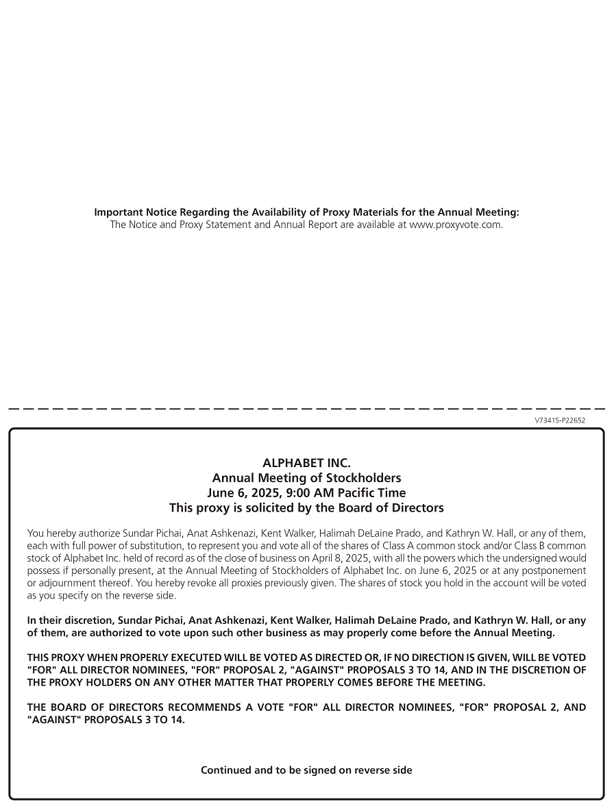 Important Notice Regarding the Availability of Proxy Materials for the Annual Meeting: The Notice and Proxy Statement and Annual Report are available at www.proxyvote.com. V73415-P22652 ALPHABET INC. Annual Meeting of Stockholders June 6, 2025, 9:00 AM Pacific Time This proxy is solicited by the Board of Directors You hereby authorize Sundar Pichai, Anat Ashkenazi, Kent Walker, Halimah DeLaine Prado, and Kathryn W. Hall, or any of them, each with full power of substitution, to represent you and vote all of the shares of Class A common stock and/or Class B common stock of Alphabet Inc. held of record as of the close of business on April 8, 2025, with all the powers which the undersigned would possess if personally present, at the Annual Meeting of Stockholders of Alphabet Inc. on June 6, 2025 or at any postponement or adjournment thereof. You hereby revoke all proxies previously given. The shares of stock you hold in the account will be voted as you specify on the reverse side. In their discretion, Sundar Pichai, Anat Ashkenazi, Kent Walker, Halimah DeLaine Prado, and Kathryn W. Hall, or any of them, are authorized to vote upon such other business as may properly come before the Annual Meeting. THIS PROXY WHEN PROPERLY EXECUTED WILL BE VOTED AS DIRECTED OR, IF NO DIRECTION IS GIVEN, WILL BE VOTED “FOR” ALL DIRECTOR NOMINEES, “FOR” PROPOSAL 2, “AGAINST” PROPOSALS 3 TO 14, AND IN THE DISCRETION OF THE PROXY HOLDERS ON ANY OTHER MATTER THAT PROPERLY COMES BEFORE THE MEETING. THE BOARD OF DIRECTORS RECOMMENDS A VOTE “FOR” ALL DIRECTOR NOMINEES, “FOR” PROPOSAL 2, AND “AGAINST” PROPOSALS 3 TO 14. Continued and to be signed on reverse side