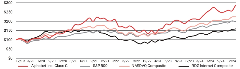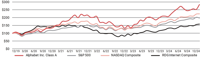 Among Alphabet Inc., the S&P 500 Index, the Nasdaq Composite Index, and the RDG Internet Composite Index