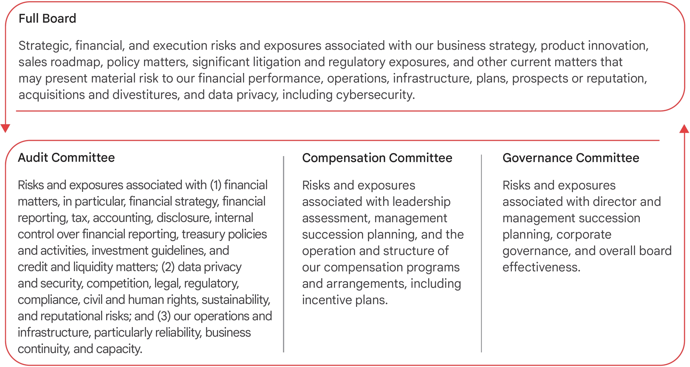| Directors with a significant background in technology, including through experience in technology-related businesses, academic and research institutions, bring critical understanding of our industry and the technological trends and innovation that shape our products, services, and AI-first strategy | Directors with experience in, and exposure to, operating within complex business environments and diverse markets, engaging with international stakeholders, and navigating global regulatory regimes and frameworks, enhance our Board’s oversight of Alphabet’s global operations, supply chains, and strategic execution | |||