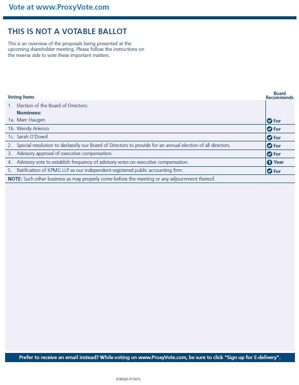 Vote at www.ProxyVote.com THIS IS NOT A VOTABLE BALLOT This is an overview of the proposals being presented at the upcoming shareholder meeting. Please follow the instructions on the reverse side to vote these important matters. Board Recommends Voting Items 1. Election of the Board of Directors: Nominees: 1a. Marc Haugen For 1b. Wendy Arienzo For 1c. Sarah O’Dowd For 2. Special resolution to declassify our Board of Directors to provide for an annual election of all directors. For 3. Advisory approval of executive compensation. For 4. Advisory vote to establish frequency of advisory votes on executive compensation. Year 1 5. Ratification of KPMG LLP as our independent registered public accounting firm. For NOTE: Such other business as may properly come before the meeting or any adjournment thereof. Prefer to receive an email instead? While voting on www.ProxyVote.com, be sure to click “Sign up for E-delivery”. D76592-P71075