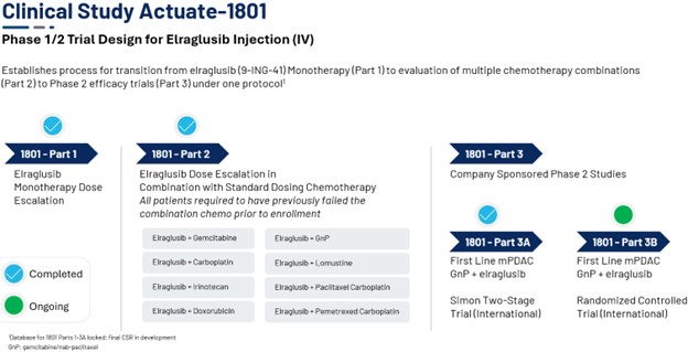 Based on the results of the Phase 1 study, we initiated a single arm Phase 2 study (“Actuate-1801 Part 3A” or “Part 3A”) in patients with previously untreated mPDAC. This study was originally designed as a single arm exploratory Simon two-stage trial (and therefore not designed or powered to demonstrate statistical significance). The elraglusib dose was started at the RP2D evaluated in the latter part of the Phase 1 trial (15 milligrams of drug per kilogram of body weight (mg/kg) administered twice weekly). No new safety signals were observed with the elraglusib/GnP combination, but investigators observed that GnP toxicities may have occurred earlier and may have been more intense in some patients than would be anticipated for GnP alone. For these reasons, the dose of elraglusib was proactively reduced near the end of the Part 3A study to 9.3 mg/kg administered twice weekly. After an analysis conducted following the completion of Part 3A, which showed an mOS of 15.3 months in the efficacy evaluable (n=29) patient population, we amended and expanded the second stage of the study to a randomized, controlled trial now powered for statistical significance (“Actuate-1801 Part 3B” or “Part 3B”) that would allow a comparison of the safety and efficacy of the combination of Elraglusib Injection plus GnP versus GnP alone in 286 patients.