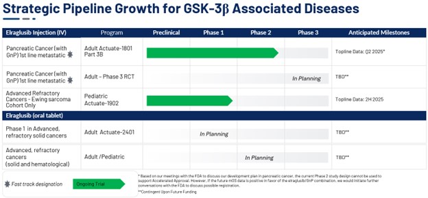 We have exclusively licensed a portfolio of GSK-3 inhibitors developed in a collaboration between The Board of Trustees of the University of Illinois-Chicago (“UIC”) and Northwestern University (“NU”). Elraglusib is the lead drug in our portfolio and is being evaluated in a randomized Phase 2 trial in patients with metastatic pancreatic ductal adenocarcinoma (“mPDAC”), our most advanced clinical indication to date. We are also advancing a Phase 1/2 clinical trial in refractory pediatric malignancies, including Ewing sarcoma (“EWS”).