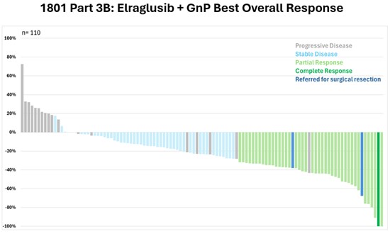 | · | The ORR was 27.7%, DCR was 42.6 %, and PFS was 5.6 months in the elraglusib/GnP combination arm versus 20.5%, 33.3% and 4.9 months in the GnP arm, respectively. | |