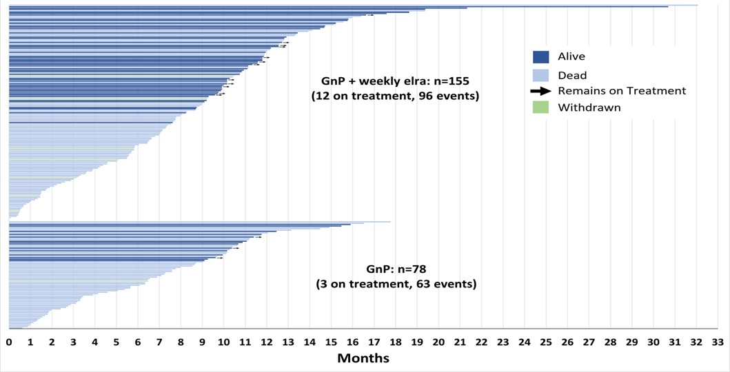 | · | In the elraglusib/GnP combination arm, 38% of subjects were still alive vs 19% in the GnP control arm. | |