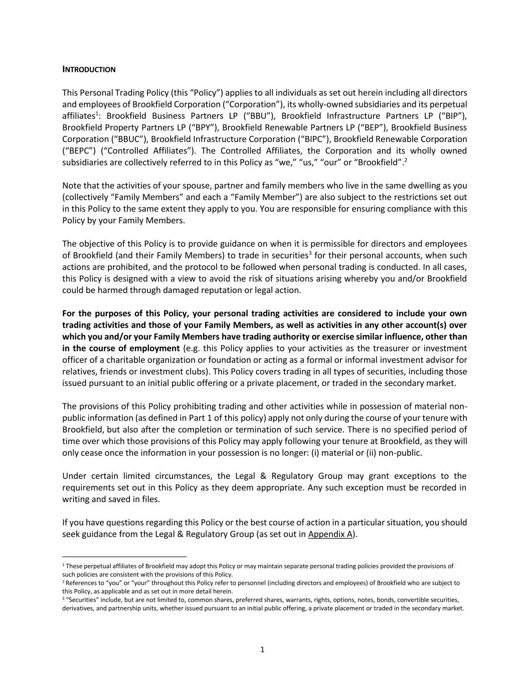 1 INTRODUCTION This Personal Trading Policy (this “Policy”) applies to all individuals as set out herein including all directors and employees of Brookfield Corporation (“Corporation”), its wholly-owned subsidiaries and its perpetual affiliates1: Brookfield Business Partners LP (“BBU”), Brookfield Infrastructure Partners LP (“BIP”), Brookfield Property Partners LP (“BPY”), Brookfield Renewable Partners LP (“BEP”), Brookfield Business Corporation (“BBUC”), Brookfield Infrastructure Corporation (“BIPC”), Brookfield Renewable Corporation (“BEPC”) (“Controlled Affiliates”). The Controlled Affiliates, the Corporation and its wholly owned subsidiaries are collectively referred to in this Policy as “we,” “us,” “our” or “Brookfield”.2 Note that the activities of your spouse, partner and family members who live in the same dwelling as you (collectively “Family Members” and each a “Family Member”) are also subject to the restrictions set out in this Policy to the same extent they apply to you. You are responsible for ensuring compliance with this Policy by your Family Members. The objective of this Policy is to provide guidance on when it is permissible for directors and employees of Brookfield (and their Family Members) to trade in securities3 for their personal accounts, when such actions are prohibited, and the protocol to be followed when personal trading is conducted. In all cases, this Policy is designed with a view to avoid the risk of situations arising whereby you and/or Brookfield could be harmed through damaged reputation or legal action. For the purposes of this Policy, your personal trading activities are considered to include your own trading activities and those of your Family Members, as well as activities in any other account(s) over which you and/or your Family Members have trading authority or exercise similar influence, other than in the course of employment (e.g. this Policy applies to your activities as the treasurer or investment officer of a charitable organization or foundation or acting as a formal or informal investment advisor for relatives, friends or investment clubs). This Policy covers trading in all types of securities, including those issued pursuant to an initial public offering or a private placement, or traded in the secondary market. The provisions of this Policy prohibiting trading and other activities while in possession of material non- public information (as defined in Part 1 of this policy) apply not only during the course of your tenure with Brookfield, but also after the completion or termination of such service. There is no specified period of time over which those provisions of this Policy may apply following your tenure at Brookfield, as they will only cease once the information in your possession is no longer: (i) material or (ii) non-public. Under certain limited circumstances, the Legal & Regulatory Group may grant exceptions to the requirements set out in this Policy as they deem appropriate. Any such exception must be recorded in writing and saved in files. If you have questions regarding this Policy or the best course of action in a particular situation, you should seek guidance from the Legal & Regulatory Group (as set out in Appendix A). 1 These perpetual affiliates of Brookfield may adopt this Policy or may maintain separate personal trading policies provided the provisions of such policies are consistent with the provisions of this Policy. 2 References to “you” or “your” throughout this Policy refer to personnel (including directors and employees) of Brookfield who are subject to this Policy, as applicable and as set out in more detail herein. 3 “Securities” include, but are not limited to, common shares, preferred shares, warrants, rights, options, notes, bonds, convertible securities, derivatives, and partnership units, whether issued pursuant to an initial public offering, a private placement or traded in the secondary market.