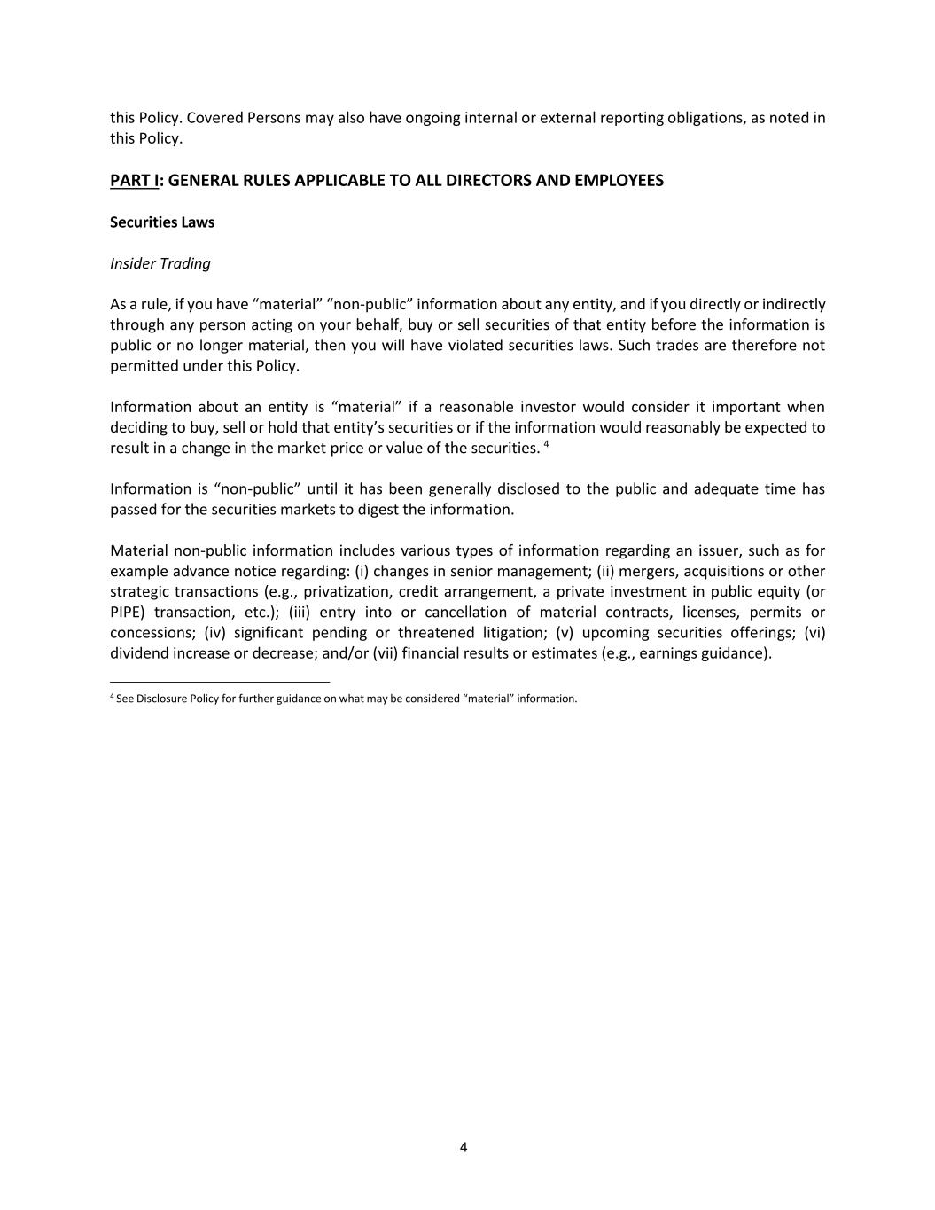 4 this Policy. Covered Persons may also have ongoing internal or external reporting obligations, as noted in this Policy. PART I: GENERAL RULES APPLICABLE TO ALL DIRECTORS AND EMPLOYEES Securities Laws Insider Trading As a rule, if you have “material” “non-public” information about any entity, and if you directly or indirectly through any person acting on your behalf, buy or sell securities of that entity before the information is public or no longer material, then you will have violated securities laws. Such trades are therefore not permitted under this Policy. Information about an entity is “material” if a reasonable investor would consider it important when deciding to buy, sell or hold that entity’s securities or if the information would reasonably be expected to result in a change in the market price or value of the securities. 4 Information is “non-public” until it has been generally disclosed to the public and adequate time has passed for the securities markets to digest the information. Material non-public information includes various types of information regarding an issuer, such as for example advance notice regarding: (i) changes in senior management; (ii) mergers, acquisitions or other strategic transactions (e.g., privatization, credit arrangement, a private investment in public equity (or PIPE) transaction, etc.); (iii) entry into or cancellation of material contracts, licenses, permits or concessions; (iv) significant pending or threatened litigation; (v) upcoming securities offerings; (vi) dividend increase or decrease; and/or (vii) financial results or estimates (e.g., earnings guidance). 4 See Disclosure Policy for further guidance on what may be considered “material” information.