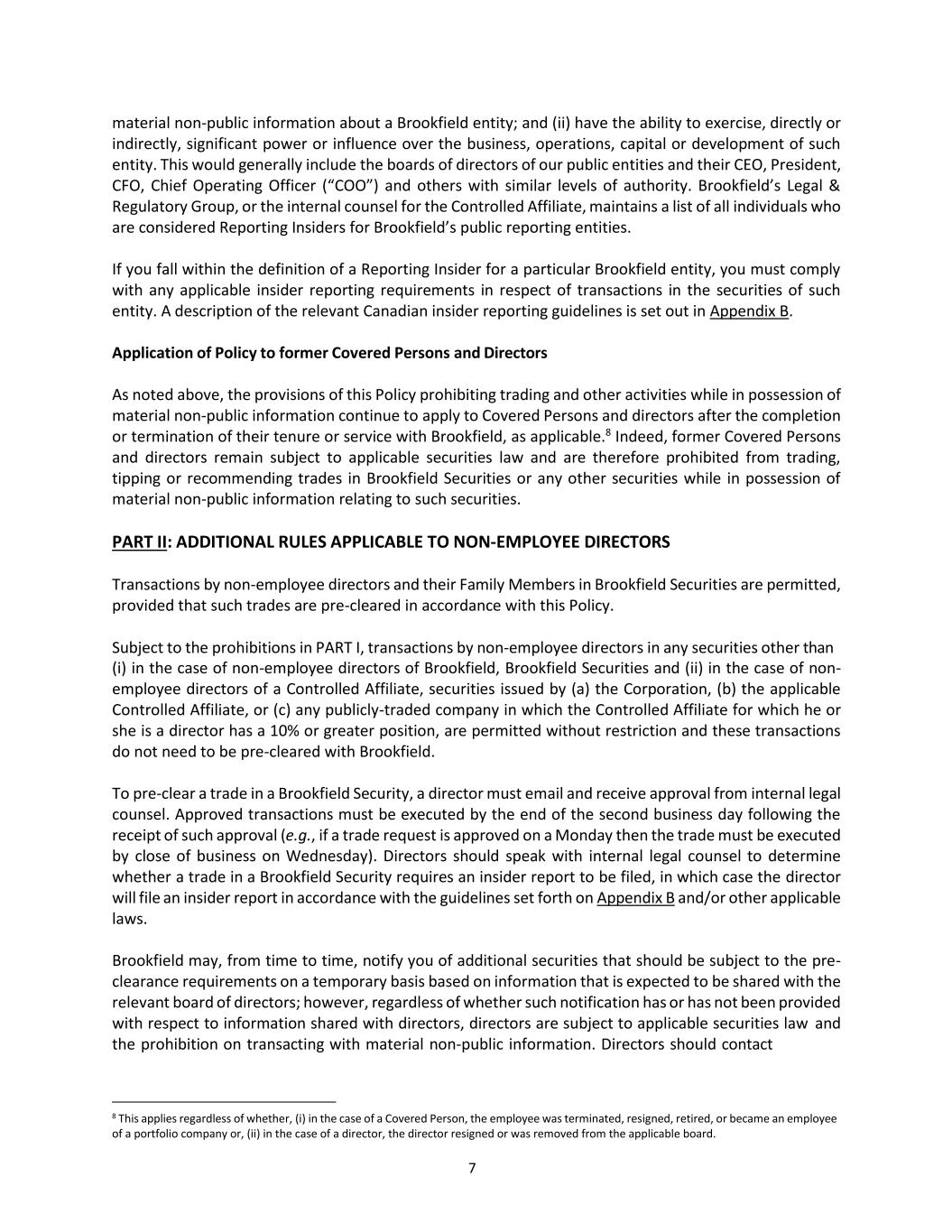 7 material non-public information about a Brookfield entity; and (ii) have the ability to exercise, directly or indirectly, significant power or influence over the business, operations, capital or development of such entity. This would generally include the boards of directors of our public entities and their CEO, President, CFO, Chief Operating Officer (“COO”) and others with similar levels of authority. Brookfield’s Legal & Regulatory Group, or the internal counsel for the Controlled Affiliate, maintains a list of all individuals who are considered Reporting Insiders for Brookfield’s public reporting entities. If you fall within the definition of a Reporting Insider for a particular Brookfield entity, you must comply with any applicable insider reporting requirements in respect of transactions in the securities of such entity. A description of the relevant Canadian insider reporting guidelines is set out in Appendix B. Application of Policy to former Covered Persons and Directors As noted above, the provisions of this Policy prohibiting trading and other activities while in possession of material non-public information continue to apply to Covered Persons and directors after the completion or termination of their tenure or service with Brookfield, as applicable.8 Indeed, former Covered Persons and directors remain subject to applicable securities law and are therefore prohibited from trading, tipping or recommending trades in Brookfield Securities or any other securities while in possession of material non-public information relating to such securities. PART II: ADDITIONAL RULES APPLICABLE TO NON-EMPLOYEE DIRECTORS Transactions by non-employee directors and their Family Members in Brookfield Securities are permitted, provided that such trades are pre-cleared in accordance with this Policy. Subject to the prohibitions in PART I, transactions by non-employee directors in any securities other than (i) in the case of non-employee directors of Brookfield, Brookfield Securities and (ii) in the case of non- employee directors of a Controlled Affiliate, securities issued by (a) the Corporation, (b) the applicable Controlled Affiliate, or (c) any publicly-traded company in which the Controlled Affiliate for which he or she is a director has a 10% or greater position, are permitted without restriction and these transactions do not need to be pre-cleared with Brookfield. To pre-clear a trade in a Brookfield Security, a director must email and receive approval from internal legal counsel. Approved transactions must be executed by the end of the second business day following the receipt of such approval (e.g., if a trade request is approved on a Monday then the trade must be executed by close of business on Wednesday). Directors should speak with internal legal counsel to determine whether a trade in a Brookfield Security requires an insider report to be filed, in which case the director will file an insider report in accordance with the guidelines set forth on Appendix B and/or other applicable laws. Brookfield may, from time to time, notify you of additional securities that should be subject to the pre- clearance requirements on a temporary basis based on information that is expected to be shared with the relevant board of directors; however, regardless of whether such notification has or has not been provided with respect to information shared with directors, directors are subject to applicable securities law and the prohibition on transacting with material non-public information. Directors should contact 8 This applies regardless of whether, (i) in the case of a Covered Person, the employee was terminated, resigned, retired, or became an employee of a portfolio company or, (ii) in the case of a director, the director resigned or was removed from the applicable board.