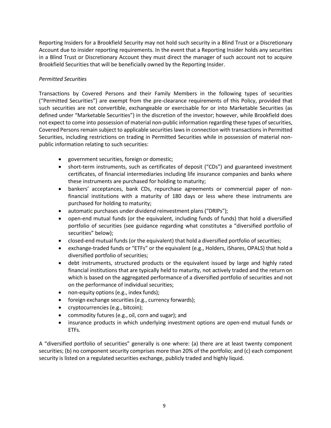 9 Reporting Insiders for a Brookfield Security may not hold such security in a Blind Trust or a Discretionary Account due to insider reporting requirements. In the event that a Reporting Insider holds any securities in a Blind Trust or Discretionary Account they must direct the manager of such account not to acquire Brookfield Securities that will be beneficially owned by the Reporting Insider. Permitted Securities Transactions by Covered Persons and their Family Members in the following types of securities (“Permitted Securities”) are exempt from the pre-clearance requirements of this Policy, provided that such securities are not convertible, exchangeable or exercisable for or into Marketable Securities (as defined under “Marketable Securities”) in the discretion of the investor; however, while Brookfield does not expect to come into possession of material non-public information regarding these types of securities, Covered Persons remain subject to applicable securities laws in connection with transactions in Permitted Securities, including restrictions on trading in Permitted Securities while in possession of material non- public information relating to such securities: • government securities, foreign or domestic; • short-term instruments, such as certificates of deposit (“CDs”) and guaranteed investment certificates, of financial intermediaries including life insurance companies and banks where these instruments are purchased for holding to maturity; • bankers’ acceptances, bank CDs, repurchase agreements or commercial paper of non- financial institutions with a maturity of 180 days or less where these instruments are purchased for holding to maturity; • automatic purchases under dividend reinvestment plans (“DRIPs”); • open-end mutual funds (or the equivalent, including funds of funds) that hold a diversified portfolio of securities (see guidance regarding what constitutes a “diversified portfolio of securities” below); • closed-end mutual funds (or the equivalent) that hold a diversified portfolio of securities; • exchange-traded funds or “ETFs” or the equivalent (e.g., Holders, iShares, OPALS) that hold a diversified portfolio of securities; • debt instruments, structured products or the equivalent issued by large and highly rated financial institutions that are typically held to maturity, not actively traded and the return on which is based on the aggregated performance of a diversified portfolio of securities and not on the performance of individual securities; • non-equity options (e.g., index funds); • foreign exchange securities (e.g., currency forwards); • cryptocurrencies (e.g., bitcoin); • commodity futures (e.g., oil, corn and sugar); and • insurance products in which underlying investment options are open-end mutual funds or ETFs. A “diversified portfolio of securities” generally is one where: (a) there are at least twenty component securities; (b) no component security comprises more than 20% of the portfolio; and (c) each component security is listed on a regulated securities exchange, publicly traded and highly liquid.