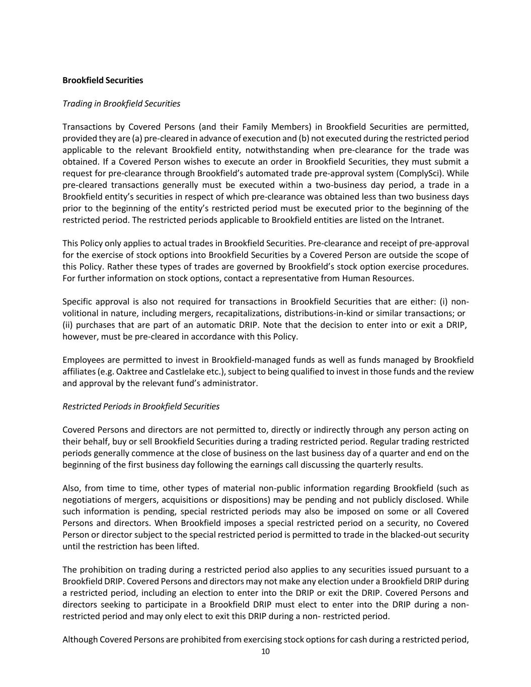 10 Brookfield Securities Trading in Brookfield Securities Transactions by Covered Persons (and their Family Members) in Brookfield Securities are permitted, provided they are (a) pre-cleared in advance of execution and (b) not executed during the restricted period applicable to the relevant Brookfield entity, notwithstanding when pre-clearance for the trade was obtained. If a Covered Person wishes to execute an order in Brookfield Securities, they must submit a request for pre-clearance through Brookfield’s automated trade pre-approval system (ComplySci). While pre-cleared transactions generally must be executed within a two-business day period, a trade in a Brookfield entity’s securities in respect of which pre-clearance was obtained less than two business days prior to the beginning of the entity’s restricted period must be executed prior to the beginning of the restricted period. The restricted periods applicable to Brookfield entities are listed on the Intranet. This Policy only applies to actual trades in Brookfield Securities. Pre-clearance and receipt of pre-approval for the exercise of stock options into Brookfield Securities by a Covered Person are outside the scope of this Policy. Rather these types of trades are governed by Brookfield’s stock option exercise procedures. For further information on stock options, contact a representative from Human Resources. Specific approval is also not required for transactions in Brookfield Securities that are either: (i) non- volitional in nature, including mergers, recapitalizations, distributions-in-kind or similar transactions; or (ii) purchases that are part of an automatic DRIP. Note that the decision to enter into or exit a DRIP, however, must be pre-cleared in accordance with this Policy. Employees are permitted to invest in Brookfield-managed funds as well as funds managed by Brookfield affiliates (e.g. Oaktree and Castlelake etc.), subject to being qualified to invest in those funds and the review and approval by the relevant fund’s administrator. Restricted Periods in Brookfield Securities Covered Persons and directors are not permitted to, directly or indirectly through any person acting on their behalf, buy or sell Brookfield Securities during a trading restricted period. Regular trading restricted periods generally commence at the close of business on the last business day of a quarter and end on the beginning of the first business day following the earnings call discussing the quarterly results. Also, from time to time, other types of material non-public information regarding Brookfield (such as negotiations of mergers, acquisitions or dispositions) may be pending and not publicly disclosed. While such information is pending, special restricted periods may also be imposed on some or all Covered Persons and directors. When Brookfield imposes a special restricted period on a security, no Covered Person or director subject to the special restricted period is permitted to trade in the blacked-out security until the restriction has been lifted. The prohibition on trading during a restricted period also applies to any securities issued pursuant to a Brookfield DRIP. Covered Persons and directors may not make any election under a Brookfield DRIP during a restricted period, including an election to enter into the DRIP or exit the DRIP. Covered Persons and directors seeking to participate in a Brookfield DRIP must elect to enter into the DRIP during a non- restricted period and may only elect to exit this DRIP during a non- restricted period. Although Covered Persons are prohibited from exercising stock options for cash during a restricted period,