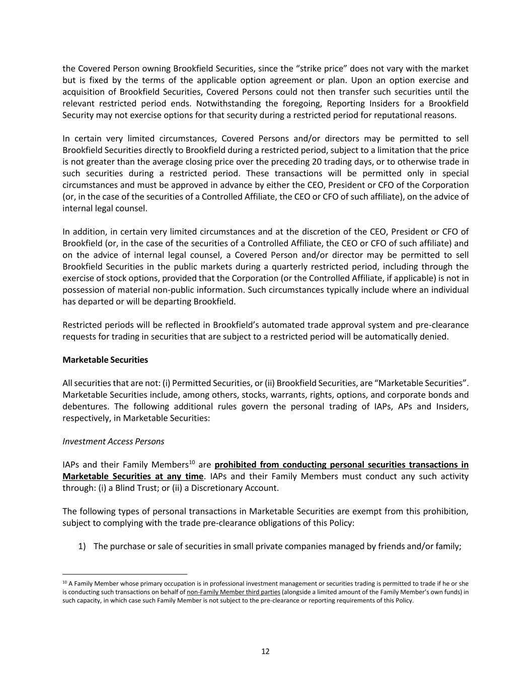 12 the Covered Person owning Brookfield Securities, since the “strike price” does not vary with the market but is fixed by the terms of the applicable option agreement or plan. Upon an option exercise and acquisition of Brookfield Securities, Covered Persons could not then transfer such securities until the relevant restricted period ends. Notwithstanding the foregoing, Reporting Insiders for a Brookfield Security may not exercise options for that security during a restricted period for reputational reasons. In certain very limited circumstances, Covered Persons and/or directors may be permitted to sell Brookfield Securities directly to Brookfield during a restricted period, subject to a limitation that the price is not greater than the average closing price over the preceding 20 trading days, or to otherwise trade in such securities during a restricted period. These transactions will be permitted only in special circumstances and must be approved in advance by either the CEO, President or CFO of the Corporation (or, in the case of the securities of a Controlled Affiliate, the CEO or CFO of such affiliate), on the advice of internal legal counsel. In addition, in certain very limited circumstances and at the discretion of the CEO, President or CFO of Brookfield (or, in the case of the securities of a Controlled Affiliate, the CEO or CFO of such affiliate) and on the advice of internal legal counsel, a Covered Person and/or director may be permitted to sell Brookfield Securities in the public markets during a quarterly restricted period, including through the exercise of stock options, provided that the Corporation (or the Controlled Affiliate, if applicable) is not in possession of material non-public information. Such circumstances typically include where an individual has departed or will be departing Brookfield. Restricted periods will be reflected in Brookfield’s automated trade approval system and pre-clearance requests for trading in securities that are subject to a restricted period will be automatically denied. Marketable Securities All securities that are not: (i) Permitted Securities, or (ii) Brookfield Securities, are “Marketable Securities”. Marketable Securities include, among others, stocks, warrants, rights, options, and corporate bonds and debentures. The following additional rules govern the personal trading of IAPs, APs and Insiders, respectively, in Marketable Securities: Investment Access Persons IAPs and their Family Members10 are prohibited from conducting personal securities transactions in Marketable Securities at any time. IAPs and their Family Members must conduct any such activity through: (i) a Blind Trust; or (ii) a Discretionary Account. The following types of personal transactions in Marketable Securities are exempt from this prohibition, subject to complying with the trade pre-clearance obligations of this Policy: 1) The purchase or sale of securities in small private companies managed by friends and/or family; 10 A Family Member whose primary occupation is in professional investment management or securities trading is permitted to trade if he or she is conducting such transactions on behalf of non-Family Member third parties (alongside a limited amount of the Family Member’s own funds) in such capacity, in which case such Family Member is not subject to the pre-clearance or reporting requirements of this Policy.