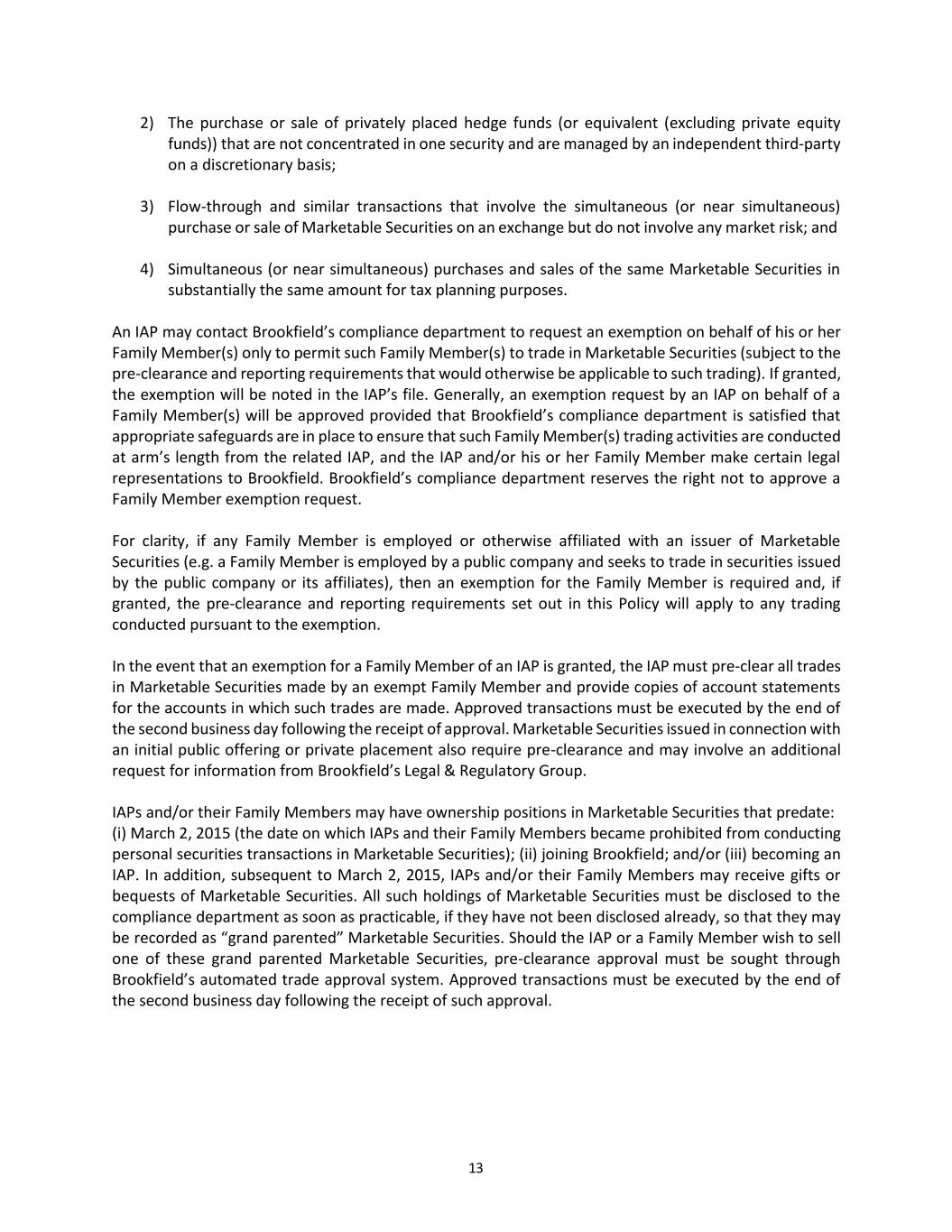 13 2) The purchase or sale of privately placed hedge funds (or equivalent (excluding private equity funds)) that are not concentrated in one security and are managed by an independent third-party on a discretionary basis; 3) Flow-through and similar transactions that involve the simultaneous (or near simultaneous) purchase or sale of Marketable Securities on an exchange but do not involve any market risk; and 4) Simultaneous (or near simultaneous) purchases and sales of the same Marketable Securities in substantially the same amount for tax planning purposes. An IAP may contact Brookfield’s compliance department to request an exemption on behalf of his or her Family Member(s) only to permit such Family Member(s) to trade in Marketable Securities (subject to the pre-clearance and reporting requirements that would otherwise be applicable to such trading). If granted, the exemption will be noted in the IAP’s file. Generally, an exemption request by an IAP on behalf of a Family Member(s) will be approved provided that Brookfield’s compliance department is satisfied that appropriate safeguards are in place to ensure that such Family Member(s) trading activities are conducted at arm’s length from the related IAP, and the IAP and/or his or her Family Member make certain legal representations to Brookfield. Brookfield’s compliance department reserves the right not to approve a Family Member exemption request. For clarity, if any Family Member is employed or otherwise affiliated with an issuer of Marketable Securities (e.g. a Family Member is employed by a public company and seeks to trade in securities issued by the public company or its affiliates), then an exemption for the Family Member is required and, if granted, the pre-clearance and reporting requirements set out in this Policy will apply to any trading conducted pursuant to the exemption. In the event that an exemption for a Family Member of an IAP is granted, the IAP must pre-clear all trades in Marketable Securities made by an exempt Family Member and provide copies of account statements for the accounts in which such trades are made. Approved transactions must be executed by the end of the second business day following the receipt of approval. Marketable Securities issued in connection with an initial public offering or private placement also require pre-clearance and may involve an additional request for information from Brookfield’s Legal & Regulatory Group. IAPs and/or their Family Members may have ownership positions in Marketable Securities that predate: (i) March 2, 2015 (the date on which IAPs and their Family Members became prohibited from conducting personal securities transactions in Marketable Securities); (ii) joining Brookfield; and/or (iii) becoming an IAP. In addition, subsequent to March 2, 2015, IAPs and/or their Family Members may receive gifts or bequests of Marketable Securities. All such holdings of Marketable Securities must be disclosed to the compliance department as soon as practicable, if they have not been disclosed already, so that they may be recorded as “grand parented” Marketable Securities. Should the IAP or a Family Member wish to sell one of these grand parented Marketable Securities, pre-clearance approval must be sought through Brookfield’s automated trade approval system. Approved transactions must be executed by the end of the second business day following the receipt of such approval.