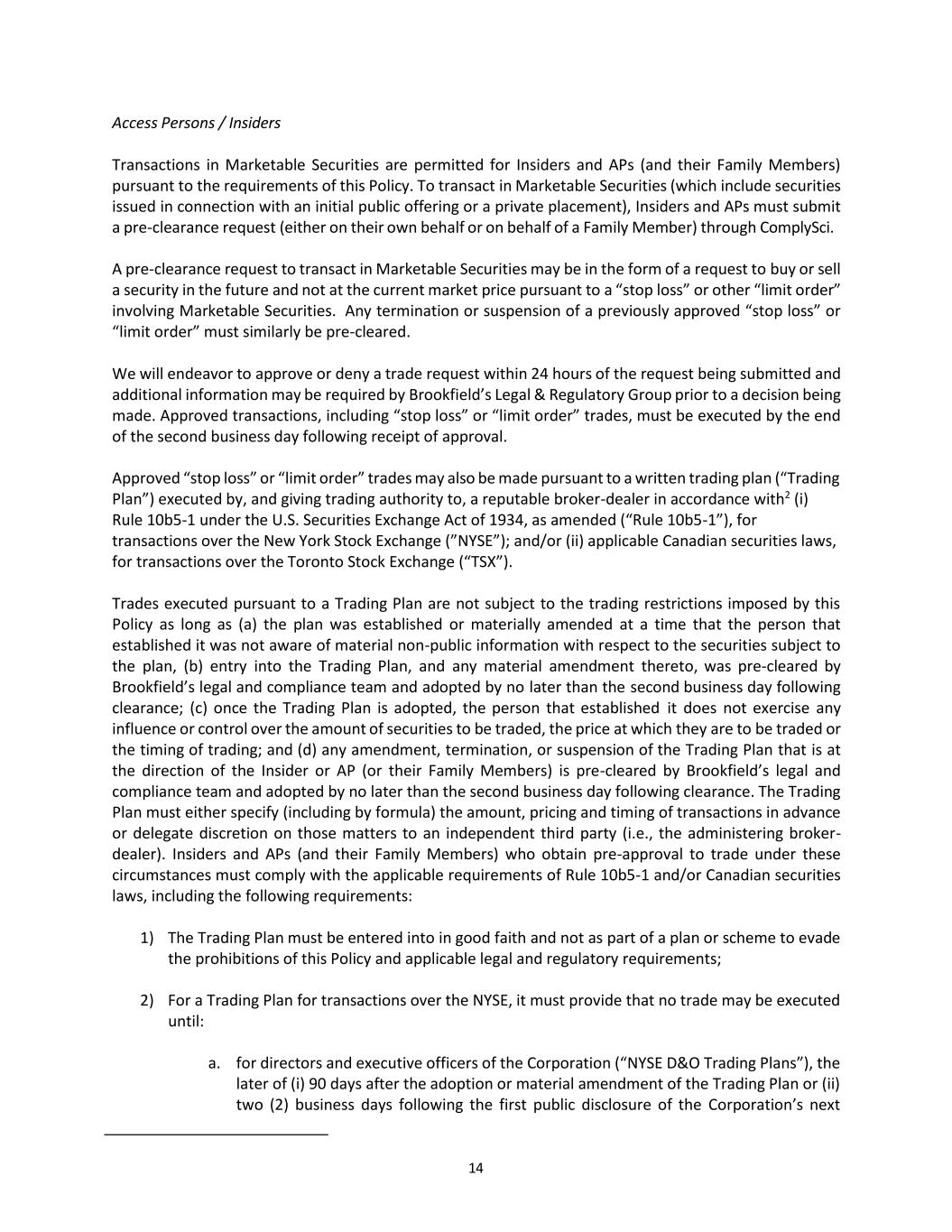 14 Access Persons / Insiders Transactions in Marketable Securities are permitted for Insiders and APs (and their Family Members) pursuant to the requirements of this Policy. To transact in Marketable Securities (which include securities issued in connection with an initial public offering or a private placement), Insiders and APs must submit a pre-clearance request (either on their own behalf or on behalf of a Family Member) through ComplySci. A pre-clearance request to transact in Marketable Securities may be in the form of a request to buy or sell a security in the future and not at the current market price pursuant to a “stop loss” or other “limit order” involving Marketable Securities. Any termination or suspension of a previously approved “stop loss” or “limit order” must similarly be pre-cleared. We will endeavor to approve or deny a trade request within 24 hours of the request being submitted and additional information may be required by Brookfield’s Legal & Regulatory Group prior to a decision being made. Approved transactions, including “stop loss” or “limit order” trades, must be executed by the end of the second business day following receipt of approval. Approved “stop loss” or “limit order” trades may also be made pursuant to a written trading plan (“Trading Plan”) executed by, and giving trading authority to, a reputable broker-dealer in accordance with2 (i) Rule 10b5-1 under the U.S. Securities Exchange Act of 1934, as amended (“Rule 10b5-1”), for transactions over the New York Stock Exchange (”NYSE”); and/or (ii) applicable Canadian securities laws, for transactions over the Toronto Stock Exchange (“TSX”). Trades executed pursuant to a Trading Plan are not subject to the trading restrictions imposed by this Policy as long as (a) the plan was established or materially amended at a time that the person that established it was not aware of material non-public information with respect to the securities subject to the plan, (b) entry into the Trading Plan, and any material amendment thereto, was pre-cleared by Brookfield’s legal and compliance team and adopted by no later than the second business day following clearance; (c) once the Trading Plan is adopted, the person that established it does not exercise any influence or control over the amount of securities to be traded, the price at which they are to be traded or the timing of trading; and (d) any amendment, termination, or suspension of the Trading Plan that is at the direction of the Insider or AP (or their Family Members) is pre-cleared by Brookfield’s legal and compliance team and adopted by no later than the second business day following clearance. The Trading Plan must either specify (including by formula) the amount, pricing and timing of transactions in advance or delegate discretion on those matters to an independent third party (i.e., the administering broker- dealer). Insiders and APs (and their Family Members) who obtain pre-approval to trade under these circumstances must comply with the applicable requirements of Rule 10b5-1 and/or Canadian securities laws, including the following requirements: 1) The Trading Plan must be entered into in good faith and not as part of a plan or scheme to evade the prohibitions of this Policy and applicable legal and regulatory requirements; 2) For a Trading Plan for transactions over the NYSE, it must provide that no trade may be executed until: a. for directors and executive officers of the Corporation (“NYSE D&O Trading Plans”), the later of (i) 90 days after the adoption or material amendment of the Trading Plan or (ii) two (2) business days following the first public disclosure of the Corporation’s next