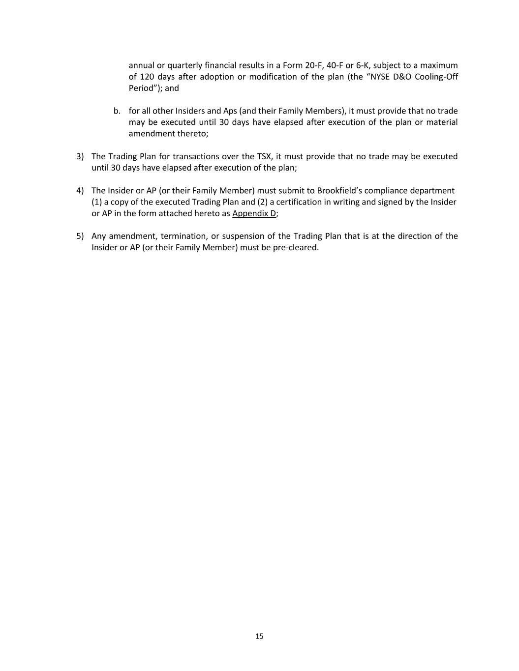15 annual or quarterly financial results in a Form 20-F, 40-F or 6-K, subject to a maximum of 120 days after adoption or modification of the plan (the “NYSE D&O Cooling-Off Period”); and b. for all other Insiders and Aps (and their Family Members), it must provide that no trade may be executed until 30 days have elapsed after execution of the plan or material amendment thereto; 3) The Trading Plan for transactions over the TSX, it must provide that no trade may be executed until 30 days have elapsed after execution of the plan; 4) The Insider or AP (or their Family Member) must submit to Brookfield’s compliance department (1) a copy of the executed Trading Plan and (2) a certification in writing and signed by the Insider or AP in the form attached hereto as Appendix D; 5) Any amendment, termination, or suspension of the Trading Plan that is at the direction of the Insider or AP (or their Family Member) must be pre-cleared.