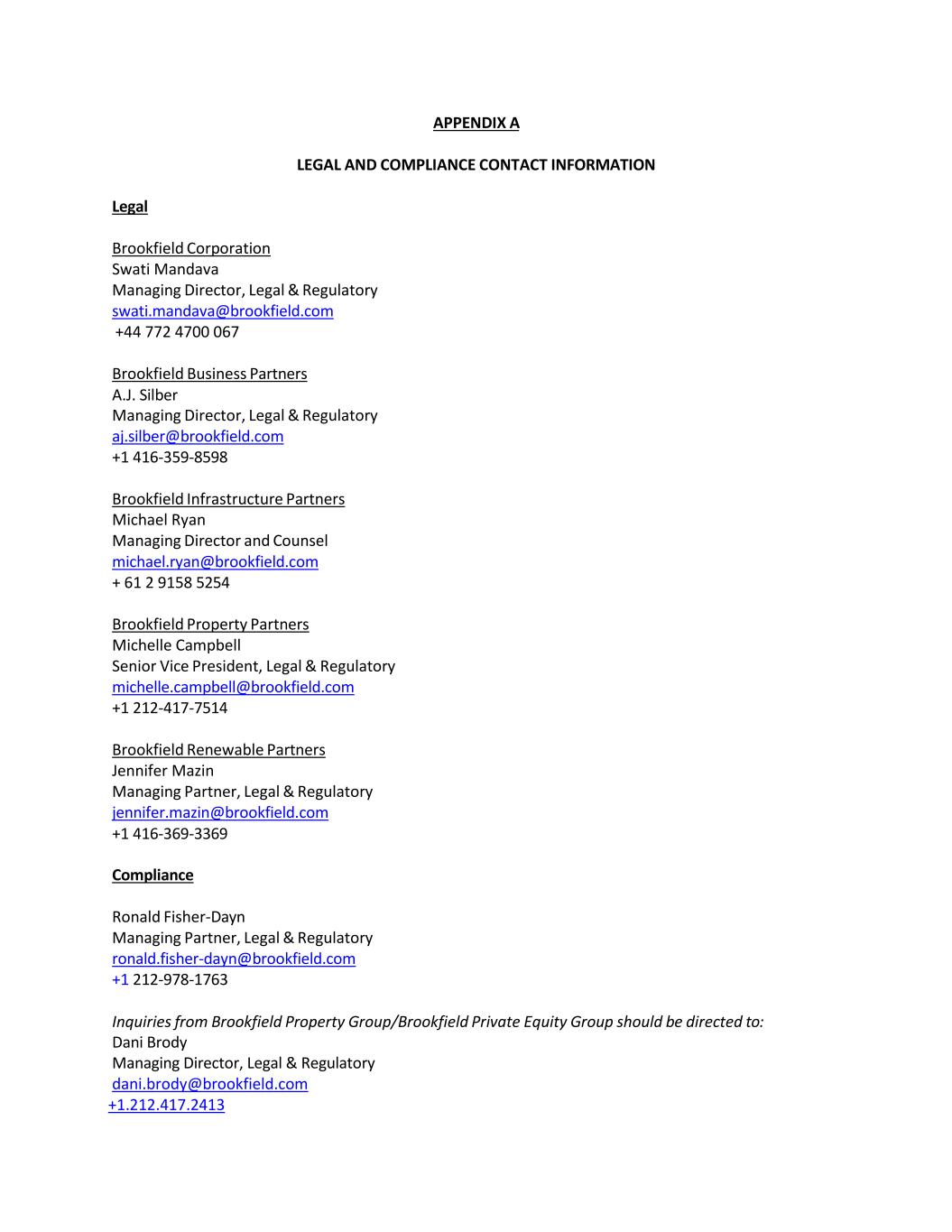APPENDIX A LEGAL AND COMPLIANCE CONTACT INFORMATION Legal Brookfield Corporation Swati Mandava Managing Director, Legal & Regulatory swati.mandava@brookfield.com +44 772 4700 067 Brookfield Business Partners A.J. Silber Managing Director, Legal & Regulatory aj.silber@brookfield.com +1 416-359-8598 Brookfield Infrastructure Partners Michael Ryan Managing Director and Counsel michael.ryan@brookfield.com + 61 2 9158 5254 Brookfield Property Partners Michelle Campbell Senior Vice President, Legal & Regulatory michelle.campbell@brookfield.com +1 212-417-7514 Brookfield Renewable Partners Jennifer Mazin Managing Partner, Legal & Regulatory jennifer.mazin@brookfield.com +1 416-369-3369 Compliance Ronald Fisher-Dayn Managing Partner, Legal & Regulatory ronald.fisher-dayn@brookfield.com +1 212-978-1763 Inquiries from Brookfield Property Group/Brookfield Private Equity Group should be directed to: Dani Brody Managing Director, Legal & Regulatory dani.brody@brookfield.com +1.212.417.2413