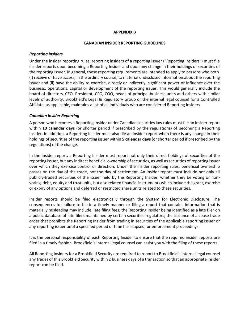 APPENDIX B CANADIAN INSIDER REPORTING GUIDELINES Reporting Insiders Under the insider reporting rules, reporting insiders of a reporting issuer (“Reporting Insiders”) must file insider reports upon becoming a Reporting Insider and upon any change in their holdings of securities of the reporting issuer. In general, these reporting requirements are intended to apply to persons who both (i) receive or have access, in the ordinary course, to material undisclosed information about the reporting issuer and (ii) have the ability to exercise, directly or indirectly, significant power or influence over the business, operations, capital or development of the reporting issuer. This would generally include the board of directors, CEO, President, CFO, COO, heads of principal business units and others with similar levels of authority. Brookfield’s Legal & Regulatory Group or the internal legal counsel for a Controlled Affiliate, as applicable, maintains a list of all individuals who are considered Reporting Insiders. Canadian Insider Reporting A person who becomes a Reporting Insider under Canadian securities law rules must file an insider report within 10 calendar days (or shorter period if prescribed by the regulations) of becoming a Reporting Insider. In addition, a Reporting Insider must also file an insider report when there is any change in their holdings of securities of the reporting issuer within 5 calendar days (or shorter period if prescribed by the regulations) of the change. In the insider report, a Reporting Insider must report not only their direct holdings of securities of the reporting issuer, but any indirect beneficial ownership of securities, as well as securities of reporting issuer over which they exercise control or direction. Under the insider reporting rules, beneficial ownership passes on the day of the trade, not the day of settlement. An insider report must include not only all publicly-traded securities of the issuer held by the Reporting Insider, whether they be voting or non- voting, debt, equity and trust units, but also related financial instruments which include the grant, exercise or expiry of any options and deferred or restricted share units related to these securities. Insider reports should be filed electronically through the System for Electronic Disclosure. The consequences for failure to file in a timely manner or filing a report that contains information that is materially misleading may include: late filing fees; the Reporting Insider being identified as a late filer on a public database of late filers maintained by certain securities regulators; the issuance of a cease trade order that prohibits the Reporting Insider from trading in securities of the applicable reporting issuer or any reporting issuer until a specified period of time has elapsed; or enforcement proceedings. It is the personal responsibility of each Reporting Insider to ensure that the required insider reports are filed in a timely fashion. Brookfield’s internal legal counsel can assist you with the filing of these reports. All Reporting Insiders for a Brookfield Security are required to report to Brookfield’s internal legal counsel any trades of this Brookfield Security within 2 business days of a transaction so that an appropriate insider report can be filed.