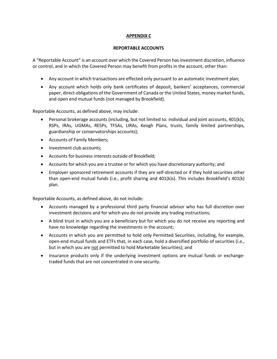 APPENDIX C REPORTABLE ACCOUNTS A “Reportable Account” is an account over which the Covered Person has investment discretion, influence or control, and in which the Covered Person may benefit from profits in the account, other than: • Any account in which transactions are effected only pursuant to an automatic investment plan; • Any account which holds only bank certificates of deposit, bankers’ acceptances, commercial paper, direct obligations of the Government of Canada or the United States, money market funds, and open end mutual funds (not managed by Brookfield). Reportable Accounts, as defined above, may include: • Personal brokerage accounts (including, but not limited to: individual and joint accounts, 401(k)s, RSPs, IRAs, UGMAs, RESPs, TFSAs, LIRAs, Keogh Plans, trusts, family limited partnerships, guardianship or conservatorships accounts); • Accounts of Family Members; • Investment club accounts; • Accounts for business interests outside of Brookfield; • Accounts for which you are a trustee or for which you have discretionary authority; and • Employer sponsored retirement accounts if they are self-directed or if they hold securities other than open-end mutual funds (i.e., profit sharing and 401(k)s). This includes Brookfield’s 401(k) plan. Reportable Accounts, as defined above, do not include: • Accounts managed by a professional third party financial advisor who has full discretion over investment decisions and for which you do not provide any trading instructions; • A blind trust in which you are a beneficiary but for which you do not receive any reporting and have no knowledge regarding the investments in the account; • Accounts in which you are permitted to hold only Permitted Securities, including, for example, open-end mutual funds and ETFs that, in each case, hold a diversified portfolio of securities (i.e., but in which you are not permitted to hold Marketable Securities); and • Insurance products only if the underlying investment options are mutual funds or exchange- traded funds that are not concentrated in one security.