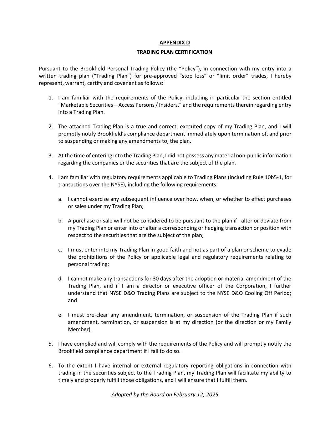 APPENDIX D TRADING PLAN CERTIFICATION Pursuant to the Brookfield Personal Trading Policy (the “Policy”), in connection with my entry into a written trading plan (“Trading Plan”) for pre-approved “stop loss” or “limit order” trades, I hereby represent, warrant, certify and covenant as follows: 1. I am familiar with the requirements of the Policy, including in particular the section entitled “Marketable Securities—Access Persons / Insiders,” and the requirements therein regarding entry into a Trading Plan. 2. The attached Trading Plan is a true and correct, executed copy of my Trading Plan, and I will promptly notify Brookfield’s compliance department immediately upon termination of, and prior to suspending or making any amendments to, the plan. 3. At the time of entering into the Trading Plan, I did not possess any material non-public information regarding the companies or the securities that are the subject of the plan. 4. I am familiar with regulatory requirements applicable to Trading Plans (including Rule 10b5-1, for transactions over the NYSE), including the following requirements: a. I cannot exercise any subsequent influence over how, when, or whether to effect purchases or sales under my Trading Plan; b. A purchase or sale will not be considered to be pursuant to the plan if I alter or deviate from my Trading Plan or enter into or alter a corresponding or hedging transaction or position with respect to the securities that are the subject of the plan; c. I must enter into my Trading Plan in good faith and not as part of a plan or scheme to evade the prohibitions of the Policy or applicable legal and regulatory requirements relating to personal trading; d. I cannot make any transactions for 30 days after the adoption or material amendment of the Trading Plan, and if I am a director or executive officer of the Corporation, I further understand that NYSE D&O Trading Plans are subject to the NYSE D&O Cooling Off Period; and e. I must pre-clear any amendment, termination, or suspension of the Trading Plan if such amendment, termination, or suspension is at my direction (or the direction or my Family Member). 5. I have complied and will comply with the requirements of the Policy and will promptly notify the Brookfield compliance department if I fail to do so. 6. To the extent I have internal or external regulatory reporting obligations in connection with trading in the securities subject to the Trading Plan, my Trading Plan will facilitate my ability to timely and properly fulfill those obligations, and I will ensure that I fulfill them. Adopted by the Board on February 12, 2025