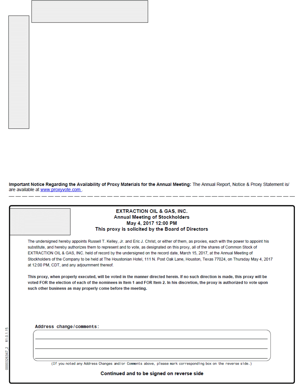Important Notice Regarding the Availability of Proxy Materials for the Annual Meeting: The Annual Report, Notice & Proxy Statement is/ are available at www.proxyvote.com . EXTRACTION OIL & GAS, INC. Annual Meeting of Stockholders May 4, 2017 12:00 PM This proxy is solicited by the Board of Directors The undersigned hereby appoints Russell T. Kelley, Jr. and Eric J. Christ, or either of them, as proxies, each with the power to appoint his substitute, and hereby authorizes them to represent and to vote, as designated on this proxy, all of the shares of Common Stock of EXTRACTION OIL & GAS, INC. held of record by the undersigned on the record date, March 15, 2017, at the Annual Meeting of Stockholders of the Company to be held at The Houstonian Hotel, 111 N. Post Oak Lane, Houston, Texas 77024, on Thursday May 4, 2017 at 12:00 PM, CDT, and any adjournment thereof. This proxy, when properly executed, will be voted in the manner directed herein. If no such direction is made, this proxy will be voted FOR the election of each of the nominees in Item 1 and FOR Item 2. In his discretion, the proxy is authorized to vote upon such other business as may properly come before the meeting. Address change/comments: (If you noted any Address Changes and/or Comments above, please mark corresponding box on the reverse side.) Continued and to be signed on reverse side 0000326347_2 R1.0.1.15