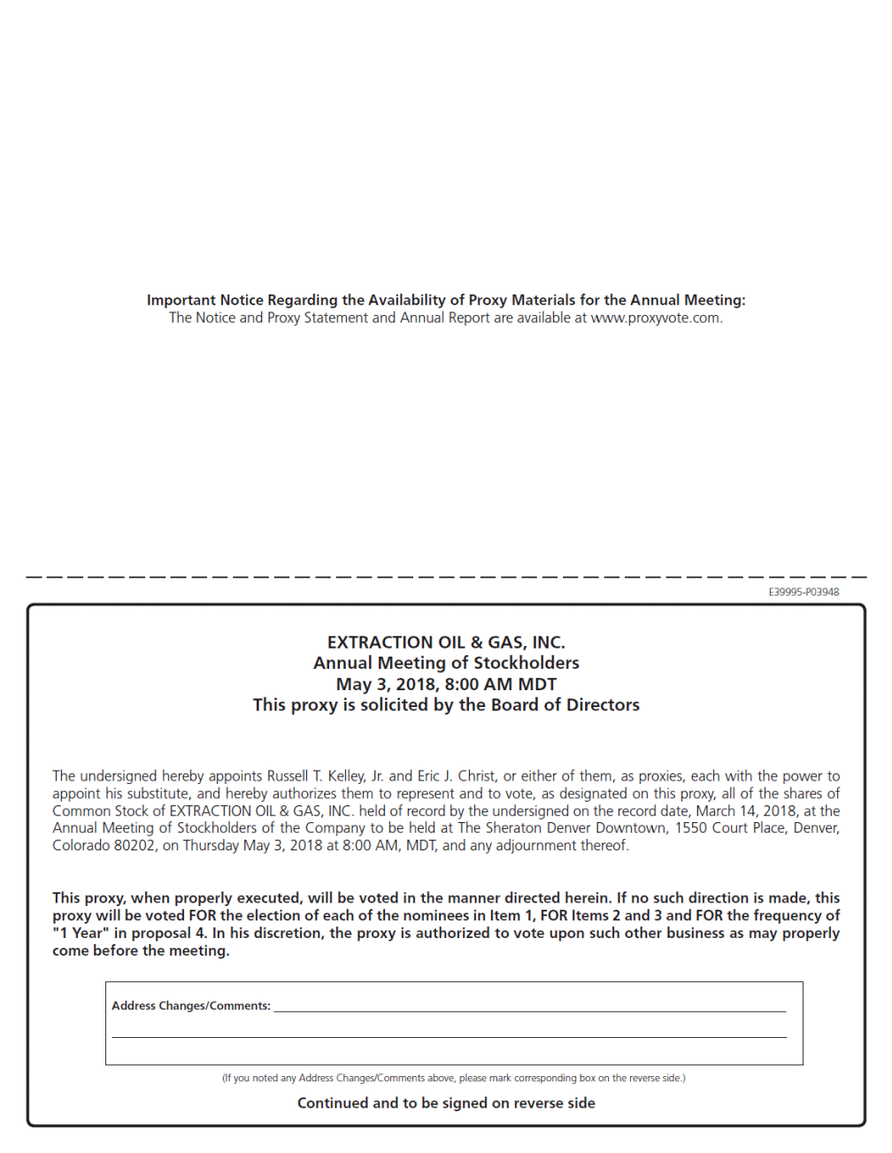 Important Notice Regarding the Availability of Proxy Materials for the Annual Meeting: The Notice and Proxy Statement and Annual Report are available at www.proxyvote.com. E39995-P03948 EXTRACTION OIL & GAS, INC. Annual Meeting of Stockholders May 3, 2018, 8:00 AM MDT This proxy is solicited by the Board of Directors The undersigned hereby appoints Russell T. Kelley, Jr. and Eric J. Christ, or either of them, as proxies, each with the power to appoint his substitute, and hereby authorizes them to represent and to vote, as designated on this proxy, all of the shares of Common Stock of EXTRACTION OIL & GAS, INC. held of record by the undersigned on the record date, March 14, 2018, at the Annual Meeting of Stockholders of the Company to be held at The Sheraton Denver Downtown, 1550 Court Place, Denver, Colorado 80202, on Thursday May 3, 2018 at 8:00 AM, MDT, and any adjournment thereof. This proxy, when properly executed, will be voted in the manner directed herein. If no such direction is made, this proxy will be voted FOR the election of each of the nominees in Item 1, FOR Items 2 and 3 and FOR the frequency of "1 Year" in proposal 4. In his discretion, the proxy is authorized to vote upon such other business as may properly come before the meeting. (If you noted any Address Changes/Comments above, please mark corresponding box on the reverse side.) Continued and to be signed on reverse side Address Changes/Comments:
