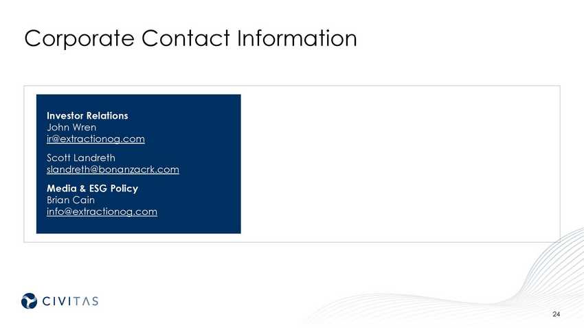 Corporate Contact Information Investor Relations John Wren ir@extractionog.com Scott Landreth slandreth@bonanzacrk.com Media & ESG Policy Brian Cain info@extractionog.com 24