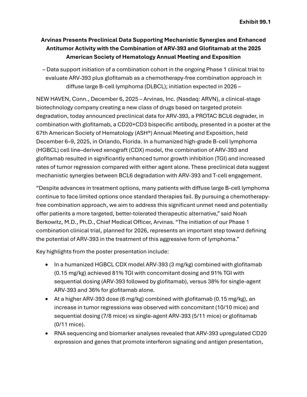 Arvinas Presents Preclinical Data Supporting Mechanistic Synergies and Enhanced Antitumor Activity with the Combination of ARV-393 and Glofitamab at the 2025 American Society of Hematology Annual Meeting and Exposition – Data support initiation of a combination cohort in the ongoing Phase 1 clinical trial to evaluate ARV-393 plus glofitamab as a chemotherapy-free combination approach in diffuse large B-cell lymphoma (DLBCL); initiation expected in 2026 – NEW HAVEN, Conn., December 6, 2025 – Arvinas, Inc. (Nasdaq: ARVN), a clinical-stage biotechnology company creating a new class of drugs based on targeted protein degradation, today announced preclinical data for ARV-393, a PROTAC BCL6 degrader, in combination with glofitamab, a CD20×CD3 bispecific antibody, presented in a poster at the 67th American Society of Hematology (ASH®) Annual Meeting and Exposition, held December 6–9, 2025, in Orlando, Florida. In a humanized high-grade B-cell lymphoma (HGBCL) cell line–derived xenograft (CDX) model, the combination of ARV-393 and glofitamab resulted in significantly enhanced tumor growth inhibition (TGI) and increased rates of tumor regression compared with either agent alone. These preclinical data suggest mechanistic synergies between BCL6 degradation with ARV-393 and T-cell engagement. “Despite advances in treatment options, many patients with diffuse large B-cell lymphoma continue to face limited options once standard therapies fail. By pursuing a chemotherapy- free combination approach, we aim to address this significant unmet need and potentially offer patients a more targeted, better-tolerated therapeutic alternative,” said Noah Berkowitz, M.D., Ph.D., Chief Medical Officer, Arvinas. “The initiation of our Phase 1 combination clinical trial, planned for 2026, represents an important step toward defining the potential of ARV-393 in the treatment of this aggressive form of lymphoma.” Key highlights from the poster presentation include: • In a humanized HGBCL CDX model ARV-393 (3 mg/kg) combined with glofitamab (0.15 mg/kg) achieved 81% TGI with concomitant dosing and 91% TGI with sequential dosing (ARV-393 followed by glofitamab), versus 38% for single-agent ARV-393 and 36% for glofitamab alone. • At a higher ARV-393 dose (6 mg/kg) combined with glofitamab (0.15 mg/kg), an increase in tumor regressions was observed with concomitant (10/10 mice) and sequential dosing (7/8 mice) vs single-agent ARV-393 (5/11 mice) or glofitamab (0/11 mice). • RNA sequencing and biomarker analyses revealed that ARV-393 upregulated CD20 expression and genes that promote interferon signaling and antigen presentation,