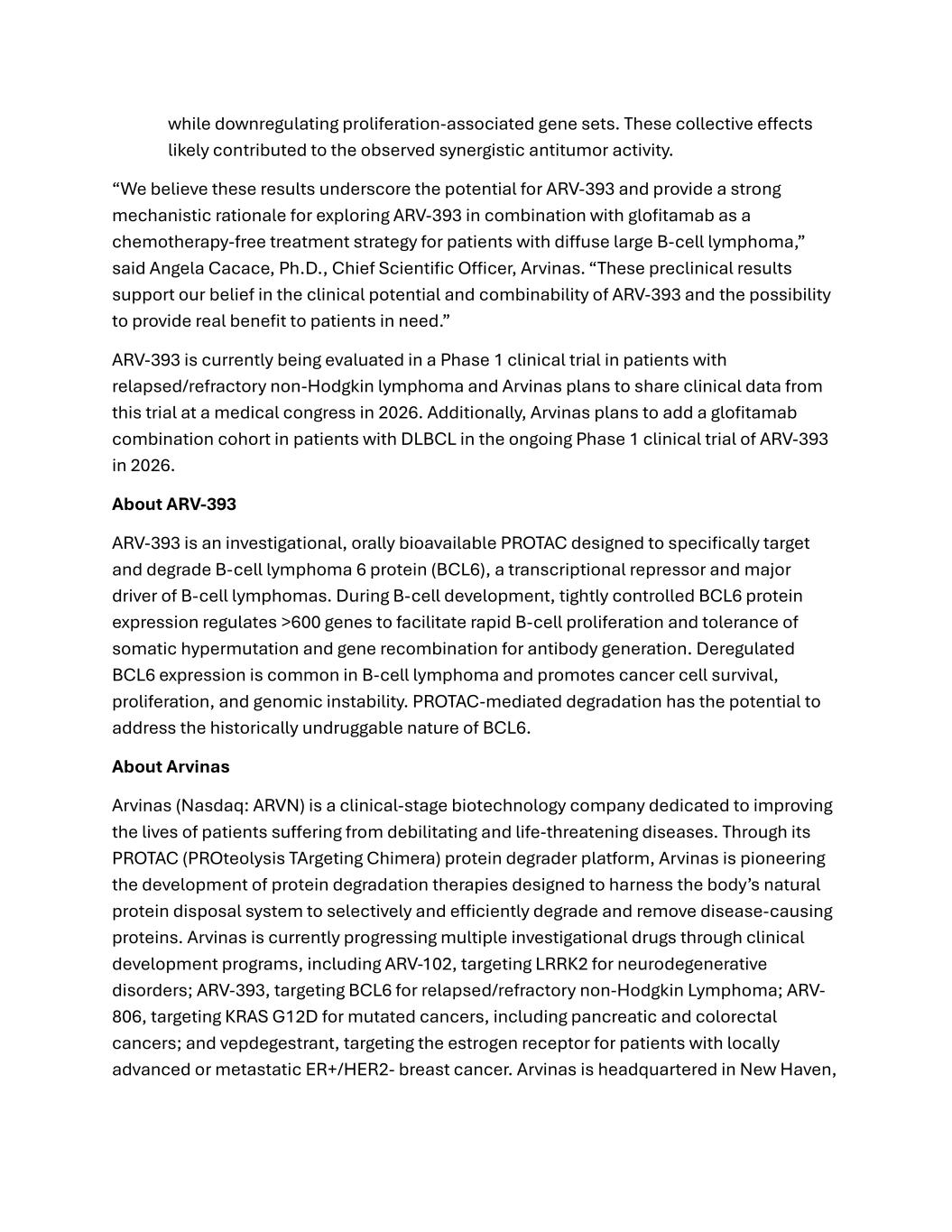 while downregulating proliferation-associated gene sets. These collective effects likely contributed to the observed synergistic antitumor activity. “We believe these results underscore the potential for ARV-393 and provide a strong mechanistic rationale for exploring ARV-393 in combination with glofitamab as a chemotherapy-free treatment strategy for patients with diffuse large B-cell lymphoma,” said Angela Cacace, Ph.D., Chief Scientific Officer, Arvinas. “These preclinical results support our belief in the clinical potential and combinability of ARV-393 and the possibility to provide real benefit to patients in need.” ARV-393 is currently being evaluated in a Phase 1 clinical trial in patients with relapsed/refractory non-Hodgkin lymphoma and Arvinas plans to share clinical data from this trial at a medical congress in 2026. Additionally, Arvinas plans to add a glofitamab combination cohort in patients with DLBCL in the ongoing Phase 1 clinical trial of ARV-393 in 2026. About ARV-393 ARV-393 is an investigational, orally bioavailable PROTAC designed to specifically target and degrade B-cell lymphoma 6 protein (BCL6), a transcriptional repressor and major driver of B-cell lymphomas. During B-cell development, tightly controlled BCL6 protein expression regulates >600 genes to facilitate rapid B-cell proliferation and tolerance of somatic hypermutation and gene recombination for antibody generation. Deregulated BCL6 expression is common in B-cell lymphoma and promotes cancer cell survival, proliferation, and genomic instability. PROTAC-mediated degradation has the potential to address the historically undruggable nature of BCL6. About Arvinas Arvinas (Nasdaq: ARVN) is a clinical-stage biotechnology company dedicated to improving the lives of patients suffering from debilitating and life-threatening diseases. Through its PROTAC (PROteolysis TArgeting Chimera) protein degrader platform, Arvinas is pioneering the development of protein degradation therapies designed to harness the body’s natural protein disposal system to selectively and efficiently degrade and remove disease-causing proteins. Arvinas is currently progressing multiple investigational drugs through clinical development programs, including ARV-102, targeting LRRK2 for neurodegenerative disorders; ARV-393, targeting BCL6 for relapsed/refractory non-Hodgkin Lymphoma; ARV- 806, targeting KRAS G12D for mutated cancers, including pancreatic and colorectal cancers; and vepdegestrant, targeting the estrogen receptor for patients with locally advanced or metastatic ER+/HER2- breast cancer. Arvinas is headquartered in New Haven,