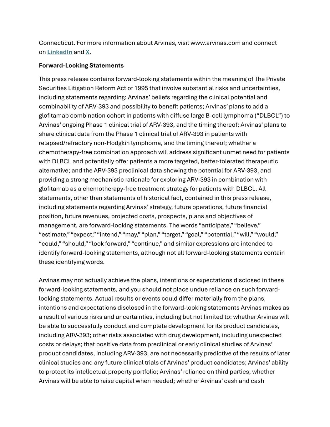 Connecticut. For more information about Arvinas, visit www.arvinas.com and connect on LinkedIn and X. Forward-Looking Statements This press release contains forward-looking statements within the meaning of The Private Securities Litigation Reform Act of 1995 that involve substantial risks and uncertainties, including statements regarding: Arvinas’ beliefs regarding the clinical potential and combinability of ARV-393 and possibility to benefit patients; Arvinas’ plans to add a glofitamab combination cohort in patients with diffuse large B-cell lymphoma (“DLBCL”) to Arvinas’ ongoing Phase 1 clinical trial of ARV-393, and the timing thereof; Arvinas’ plans to share clinical data from the Phase 1 clinical trial of ARV-393 in patients with relapsed/refractory non-Hodgkin lymphoma, and the timing thereof; whether a chemotherapy-free combination approach will address significant unmet need for patients with DLBCL and potentially offer patients a more targeted, better-tolerated therapeutic alternative; and the ARV-393 preclinical data showing the potential for ARV-393, and providing a strong mechanistic rationale for exploring ARV-393 in combination with glofitamab as a chemotherapy-free treatment strategy for patients with DLBCL. All statements, other than statements of historical fact, contained in this press release, including statements regarding Arvinas’ strategy, future operations, future financial position, future revenues, projected costs, prospects, plans and objectives of management, are forward-looking statements. The words “anticipate,” “believe,” “estimate,” “expect,” “intend,” “may,” “plan,” “target,” “goal,” “potential,” “will,” “would,” “could,” “should,” “look forward,” “continue,” and similar expressions are intended to identify forward-looking statements, although not all forward-looking statements contain these identifying words. Arvinas may not actually achieve the plans, intentions or expectations disclosed in these forward-looking statements, and you should not place undue reliance on such forward- looking statements. Actual results or events could differ materially from the plans, intentions and expectations disclosed in the forward-looking statements Arvinas makes as a result of various risks and uncertainties, including but not limited to: whether Arvinas will be able to successfully conduct and complete development for its product candidates, including ARV-393; other risks associated with drug development, including unexpected costs or delays; that positive data from preclinical or early clinical studies of Arvinas’ product candidates, including ARV-393, are not necessarily predictive of the results of later clinical studies and any future clinical trials of Arvinas’ product candidates; Arvinas’ ability to protect its intellectual property portfolio; Arvinas’ reliance on third parties; whether Arvinas will be able to raise capital when needed; whether Arvinas’ cash and cash